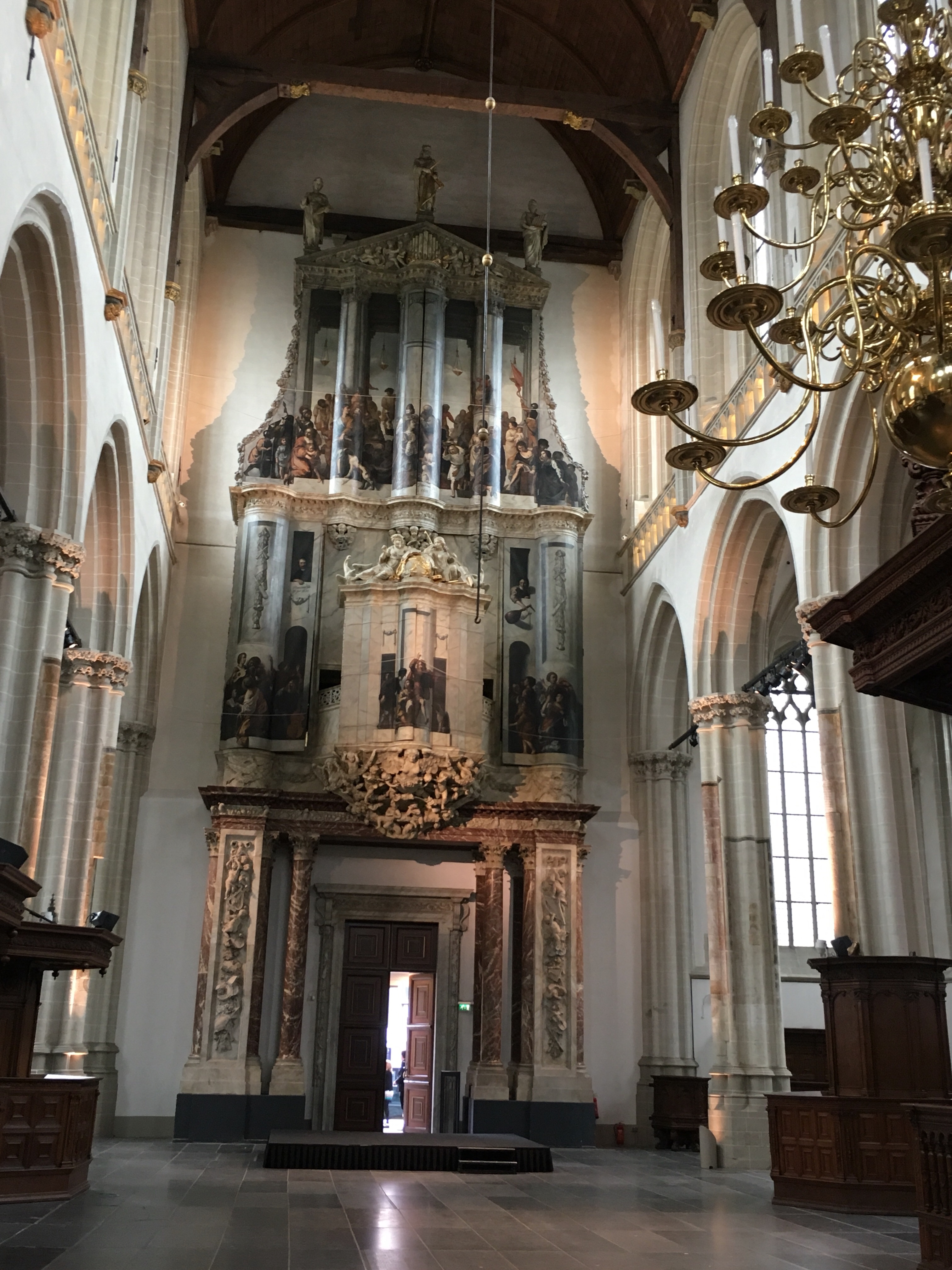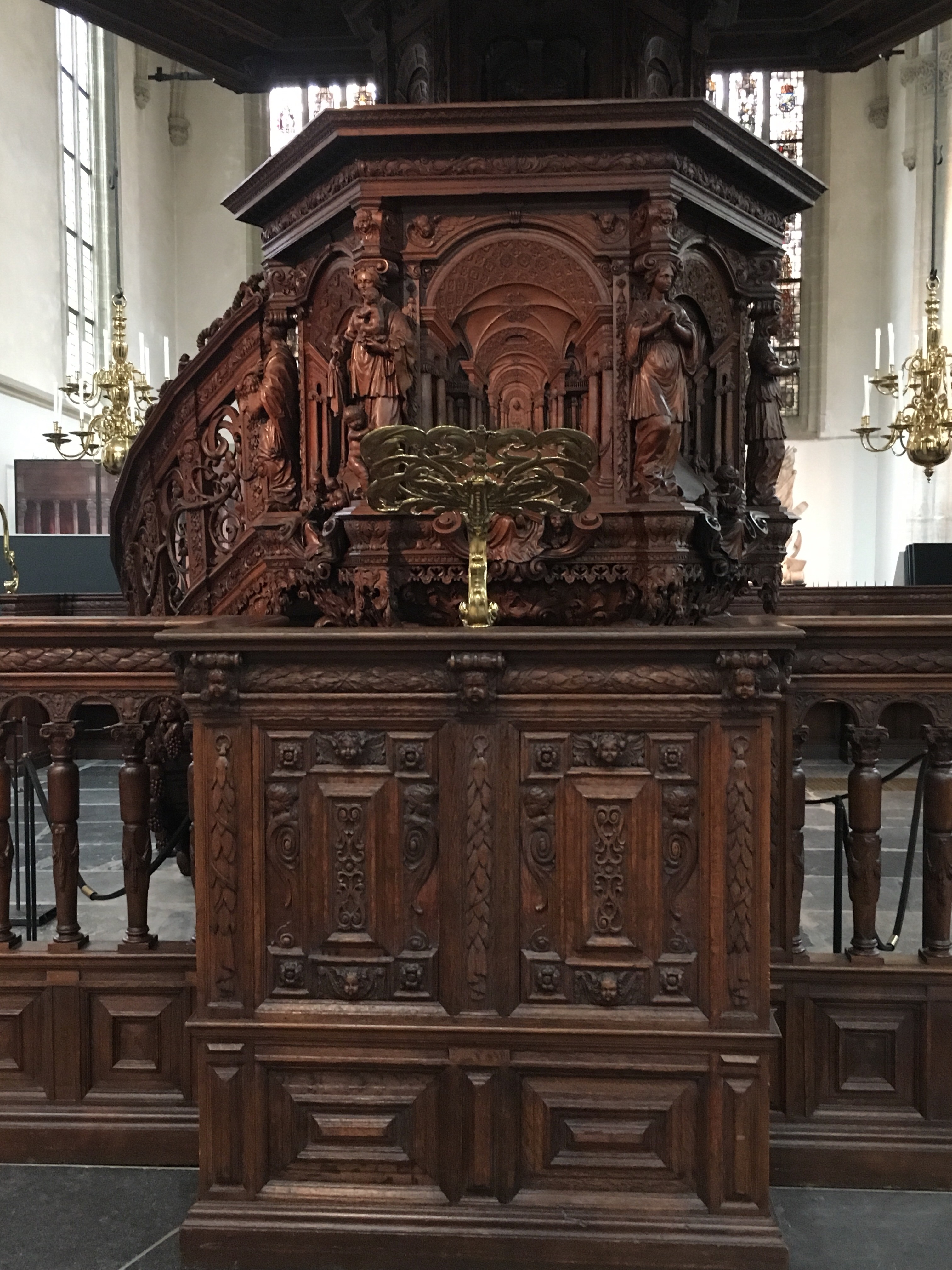Finally, while walking along a bustling cobbled street lined with modern shops and coffeehouses, I saw a laminated sign on a wooden door that announced that this hole-in-the-wall was actually a church. And they have weekly worship services. In space much less grand than the interior of the New (very old!) Church, Jesus’ name is praised. That gives me hope for my new friends in lovely Amsterdam!