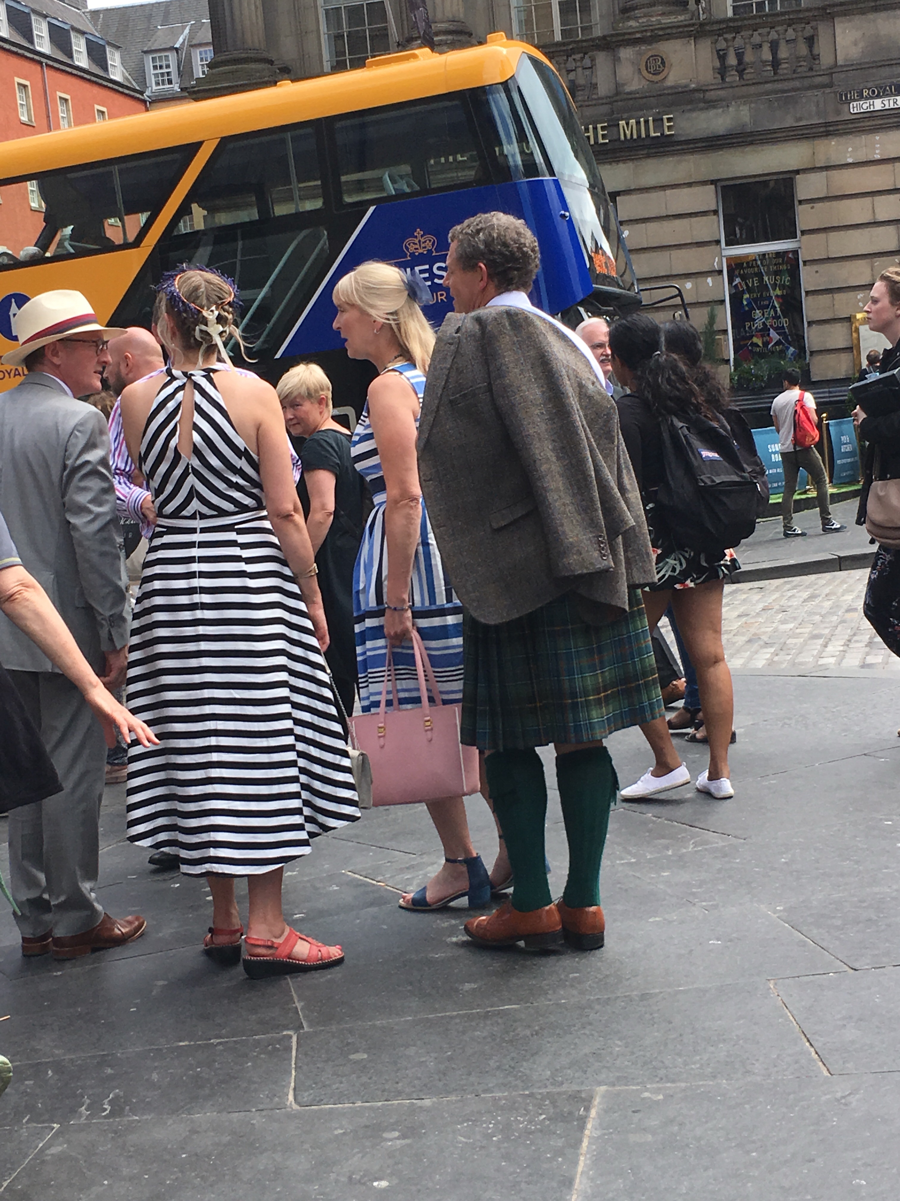 Yesterday my sisters and I were happily strolling along the Royal Mile in Ediinburgh (pronounced Edinboro with the end of the word falling off—Edinburra). Again there was a crowd massed around a wrought iron gate peering in with pairs of eyes and cell phone cameras. There were occasional cheers. We didn’t pay too much attention as we were taking in the new digs. The voyeuristic event seemed to end and the crowd dissipated. But after about 10 minutes we heard bagpipes. Truthfully there has been a bagpiper on the streets playing in full Celtic garb every time we’ve been out on the Royal Mile. But this was not the strains from one lone piper. The gates to the courtyard opened and a squadron of bag pipers marched out in unison, their music drawing people in. We soon realized something formal was happening as the musicians were preceded by a battalion of soldiers. They stared straight ahead and moved in sync. Royal Police cleared the way since the street is usually a pedestrian walkway. A couple of cars were led out with grand ceremony as we videotaped the event. Again, we didn’t know what party we had crashed. But, through frantic questioning of those around us, we learned that it was the annual Garden Party for honorable Scottish citizens, just as she had done for our benefit in London the week before! Though we never made it to the other side of the iron gates, she let us get pretty close! Long live the Queen!