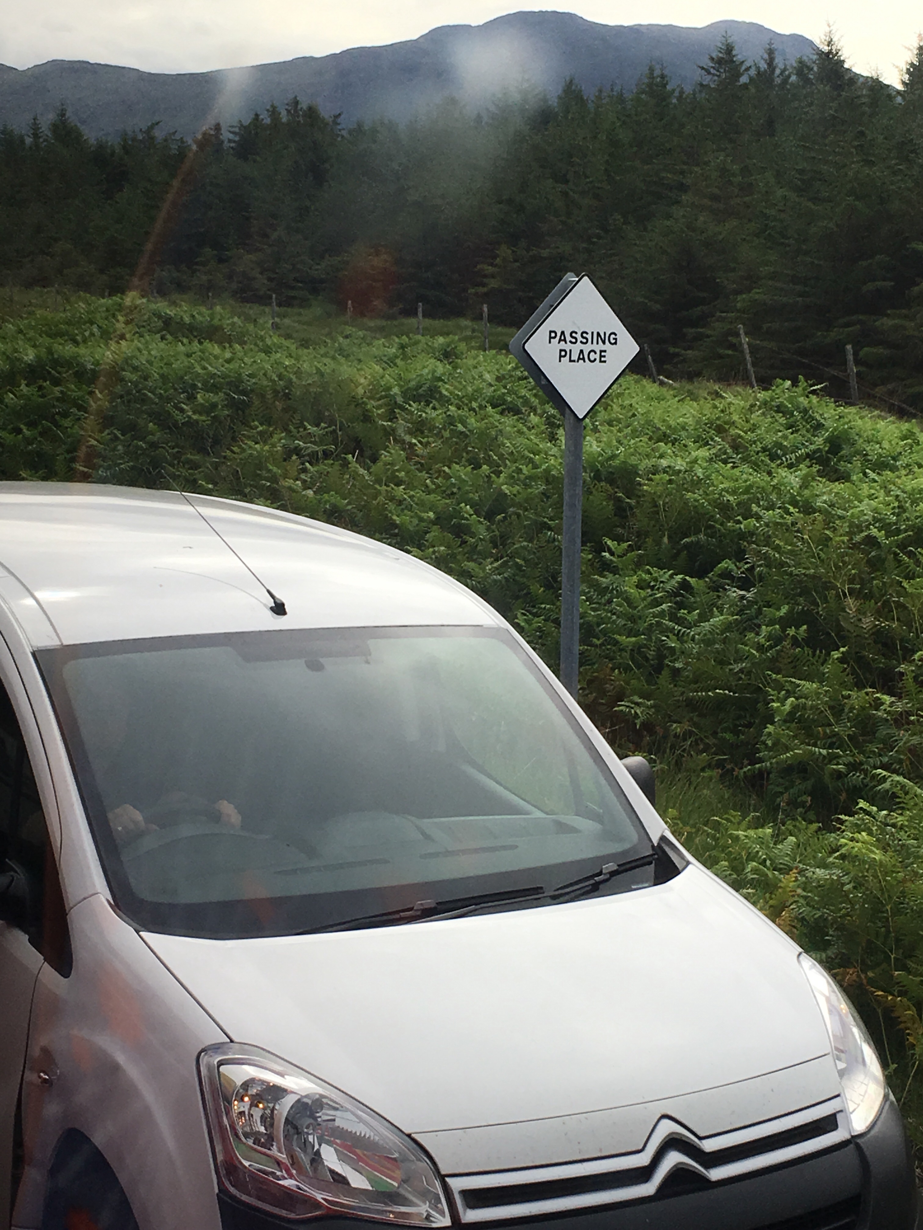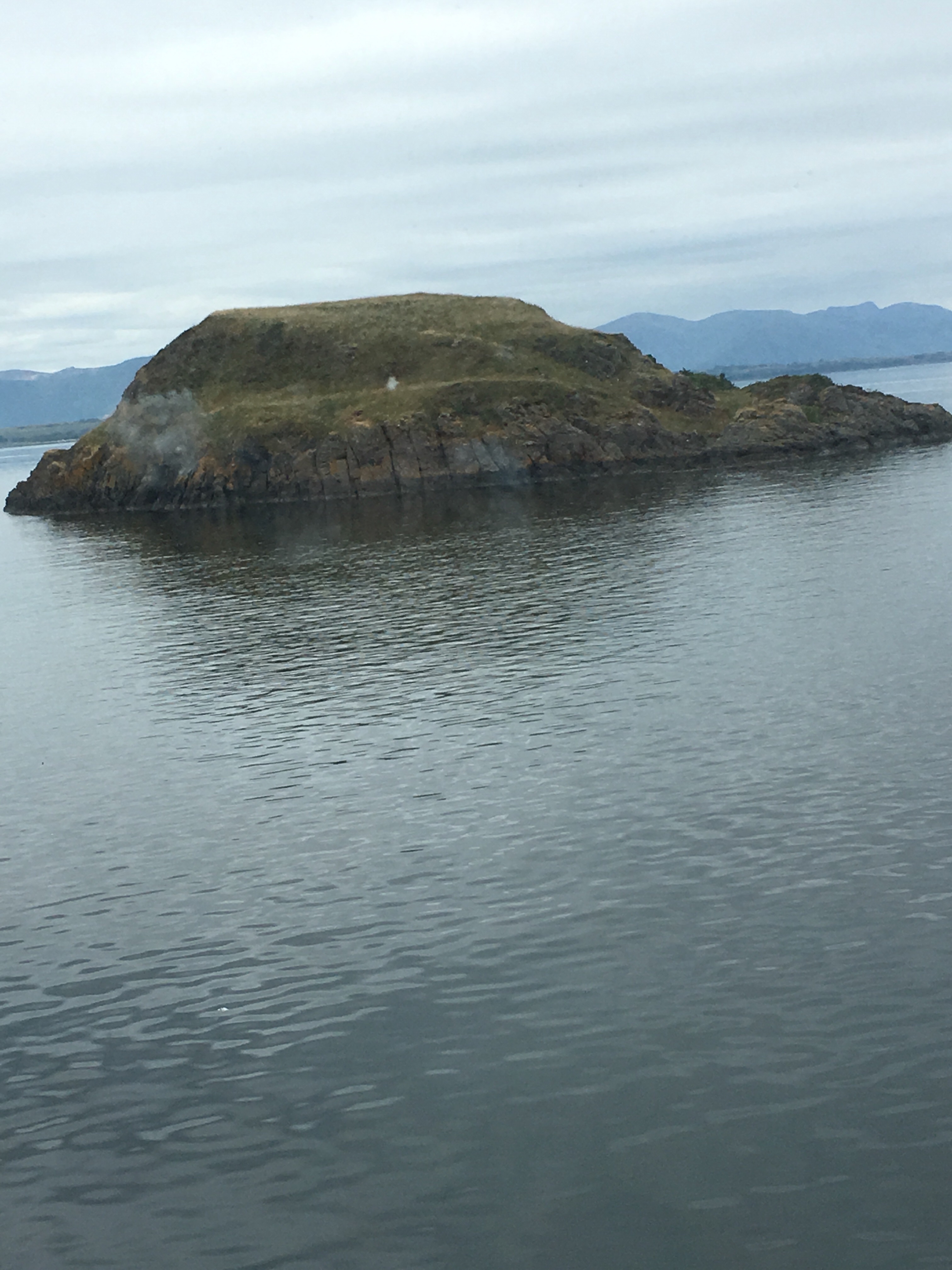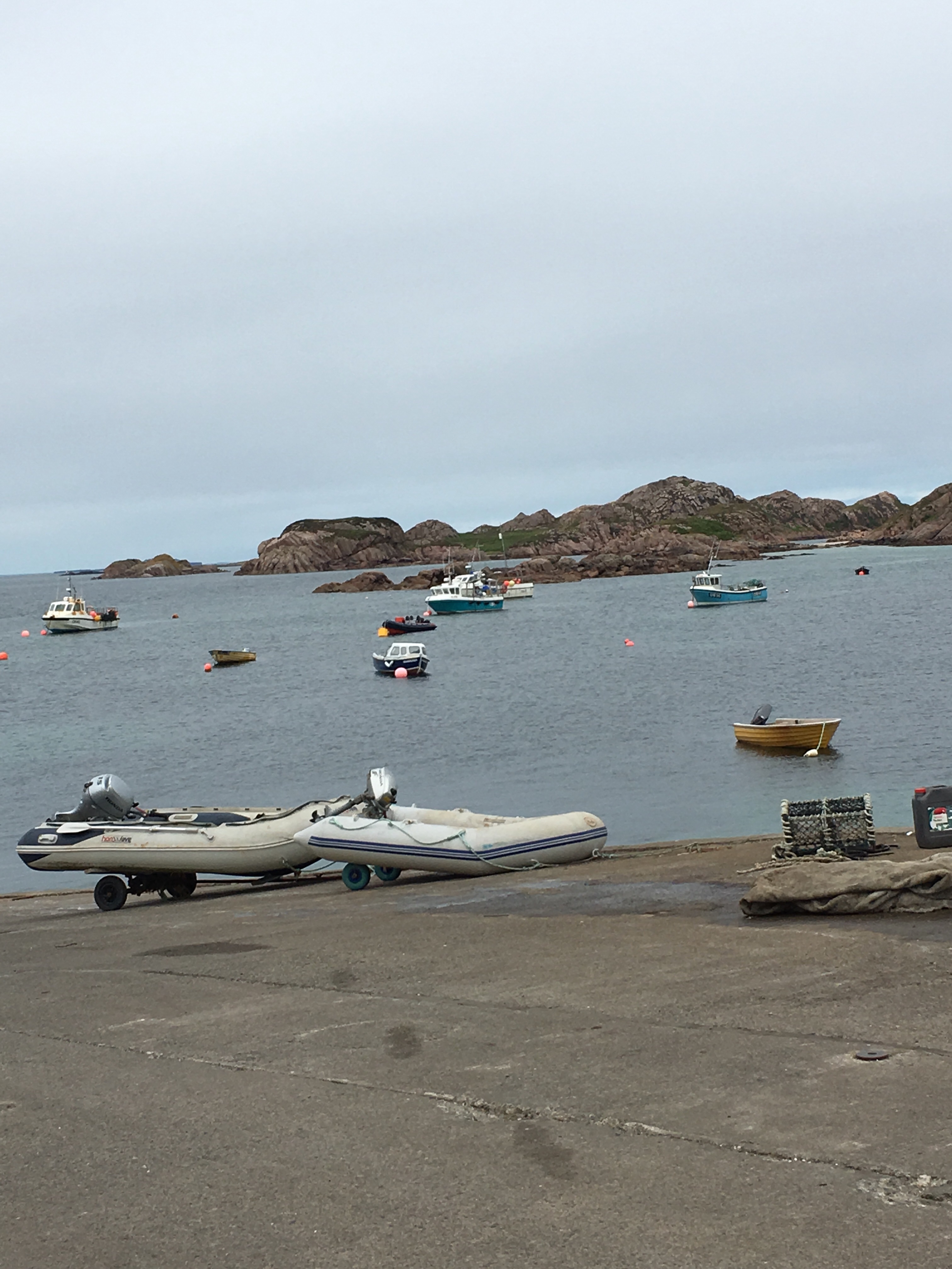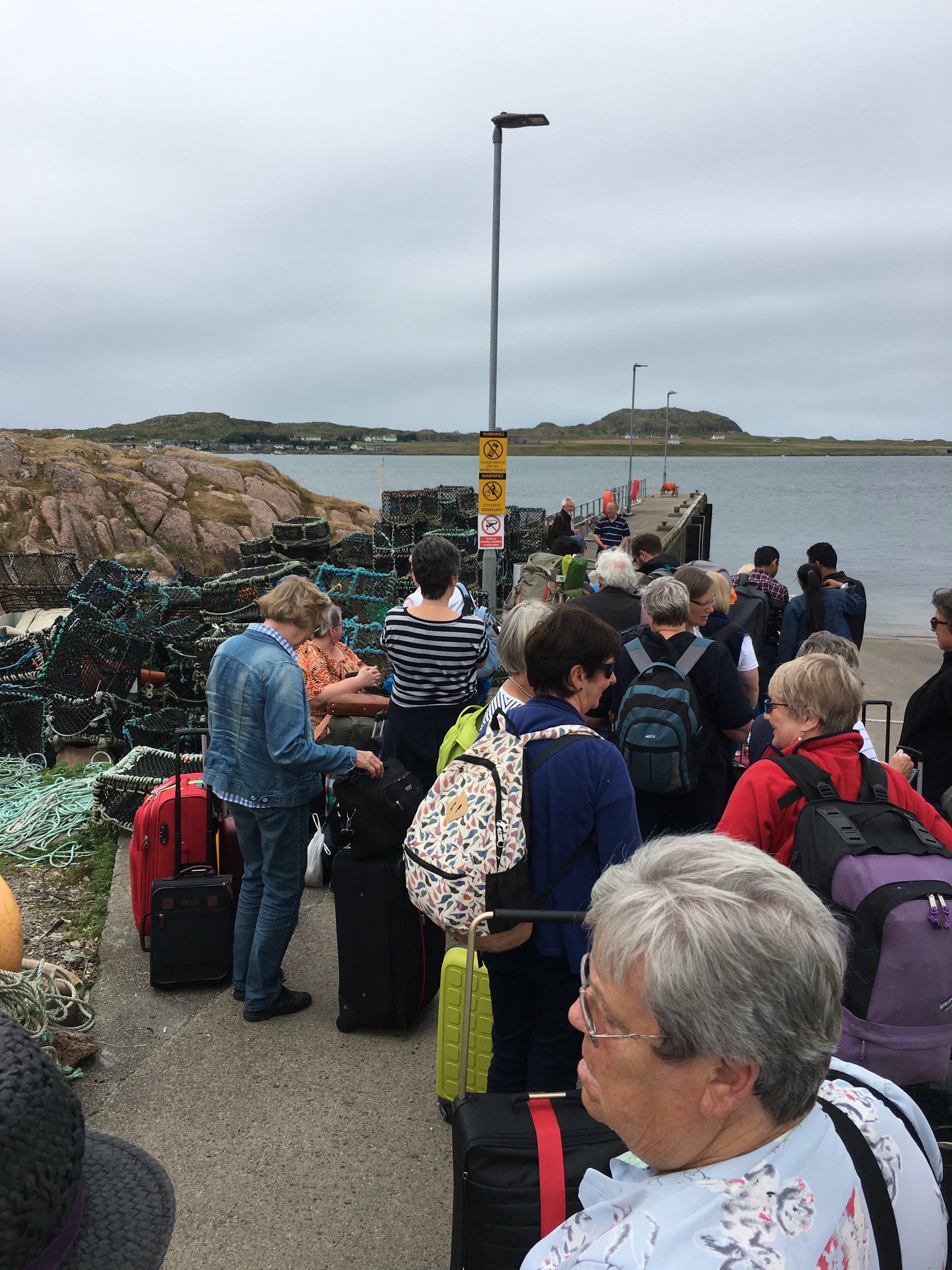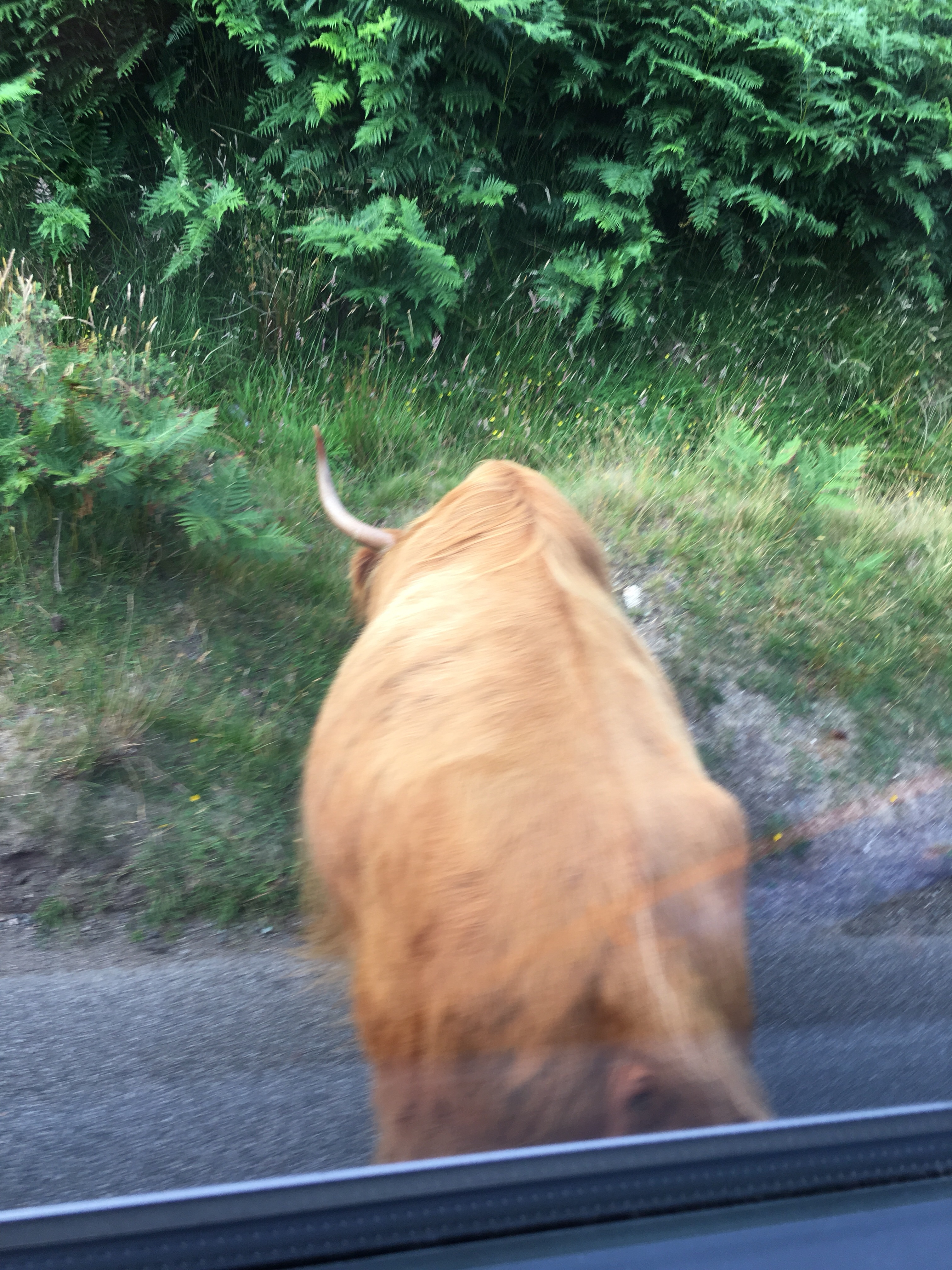 Travel on the backroads of Scotland is very different from American roads. Most people use public transportation so there are very few drivers vying for passage way. The roads are wide enough for maybe one and a quarter vehicles. This means that, as you see a car approaching you from the opposite direction, you make a quick decision about who is going to pull over into one of the designated “passing places”. Sometimes one person has to back up to a passing place so that each can then continue on their own journey. This obviously wouldn’t work if there was heavy traffic but there isn’t. Island residents jumped on and off the bus to get to appointments, jobs and social events. It wasn’t just for tourists. We were also held up at one point by a Highlander cow who was happily grazing along the side of the road. Our bus had to completely stop and yield to the reluctant response of the cow who was much more fixated on the grass than our huge vehicle. After 50 minutes through scenic territory we arrived at another port on the southwest side of the island. The final leg of the journey was a 10 minute ferry ride across to Iona.