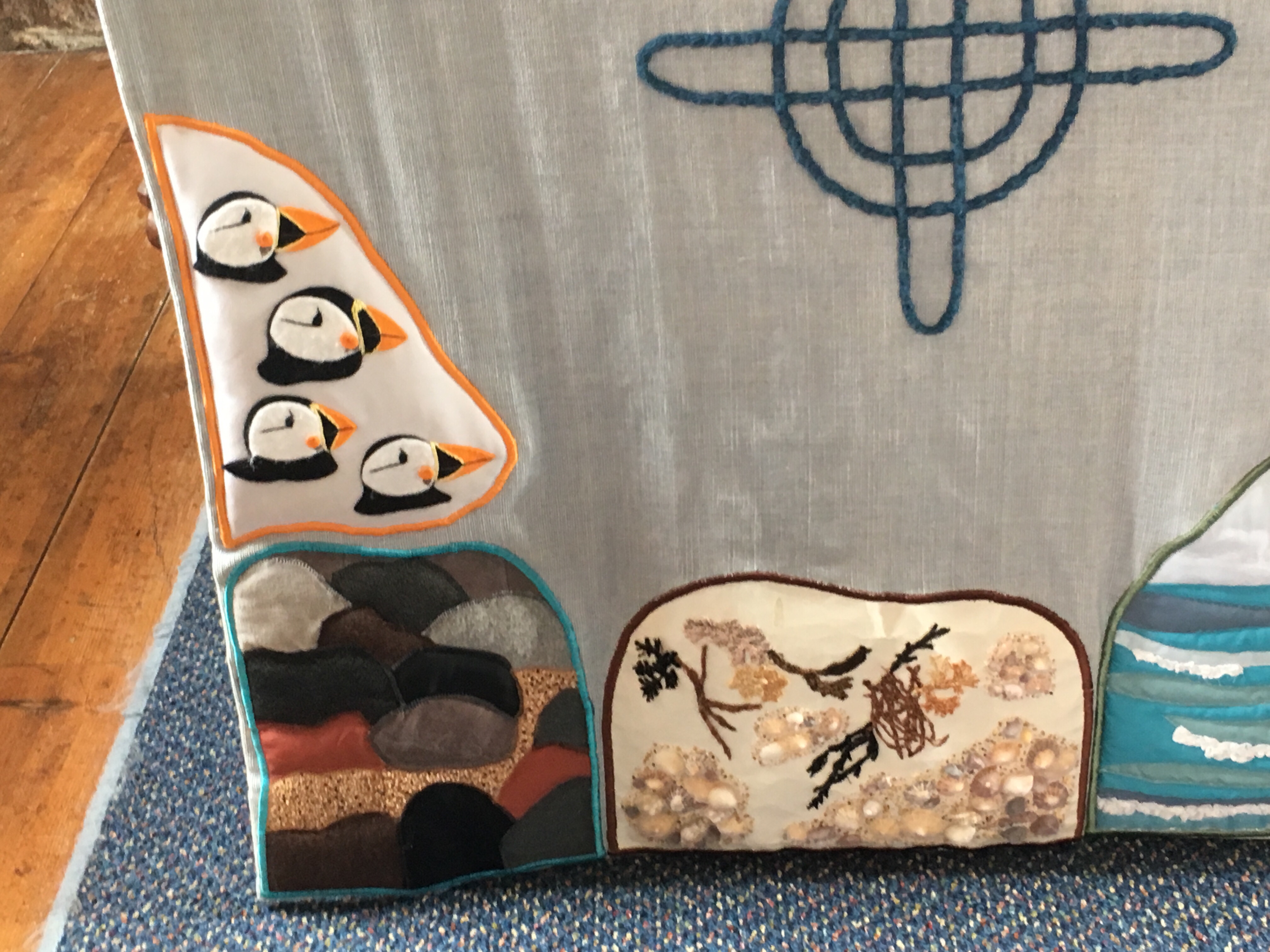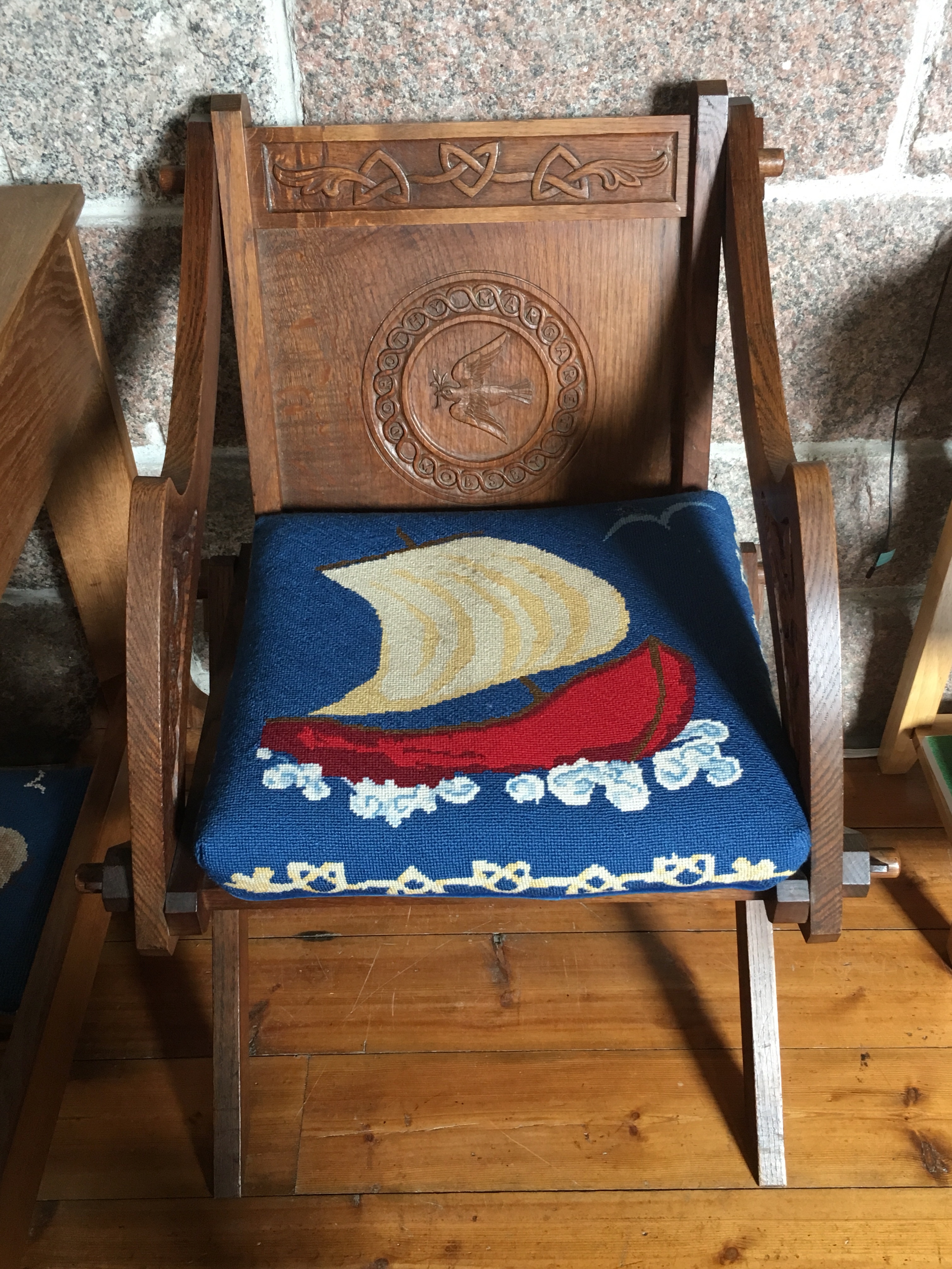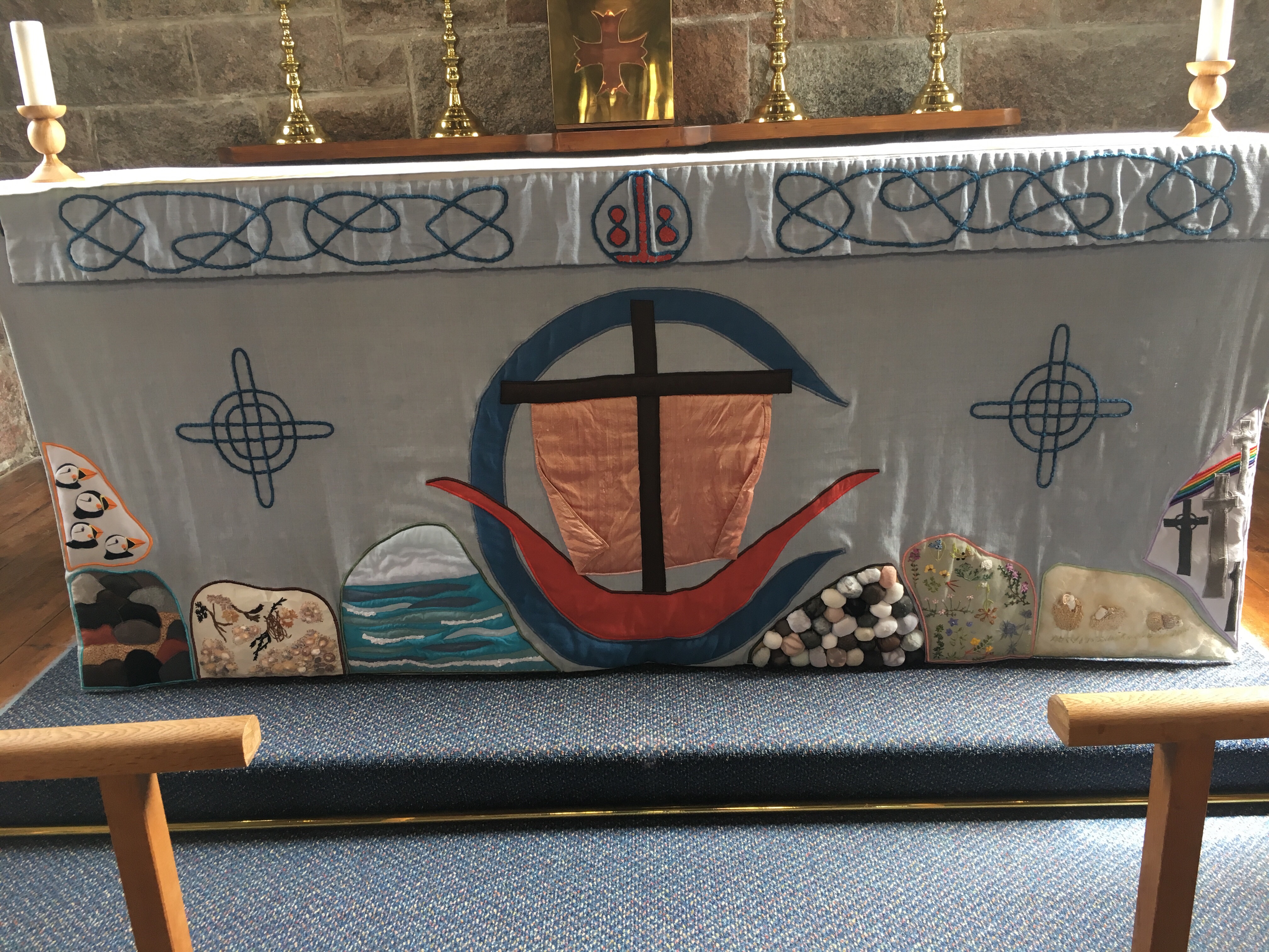 Historically there have been five churches on the east side of the island. The Abbey has morning and evening worship each day and many people visit specifically to participate in those services. There is a chapel among the ruins of a 13th-century nunnery where women served their God for several hundred years. In that same area stands the community church which was for the residents. The Abbey would have been the place for the monks to worship. Therefore those who lived on the island had their own small church where they lived out their Christian convictions. The Bishop’s House is a retreat center and it also houses a lovely chapel. I took a picture of the frontal that covers the altar. It is lovingly crafted to reflect the community in which these Christians serve. You’ll notice that there are sections depicting puffins, sheep, local flowers, and water. The central image is that of a boat whose mast forms a cross. One of the seat cushions on a Deacon’s Bench depicts a nautical scene. Life on Iona is directly impacted by the surrounding waters and the effect that the sea has upon their day-to-day experiences. To find this uniquely reflected in each parish is not surprising. Finally there is a congregation established in the 19th century that hosts a Church of Scotland congregation. Island visitors are warmly encouraged to attend worship at the three churches that still have intact buildings: the Abbey, the Bishop’s House and the Church of Scotland congregation.