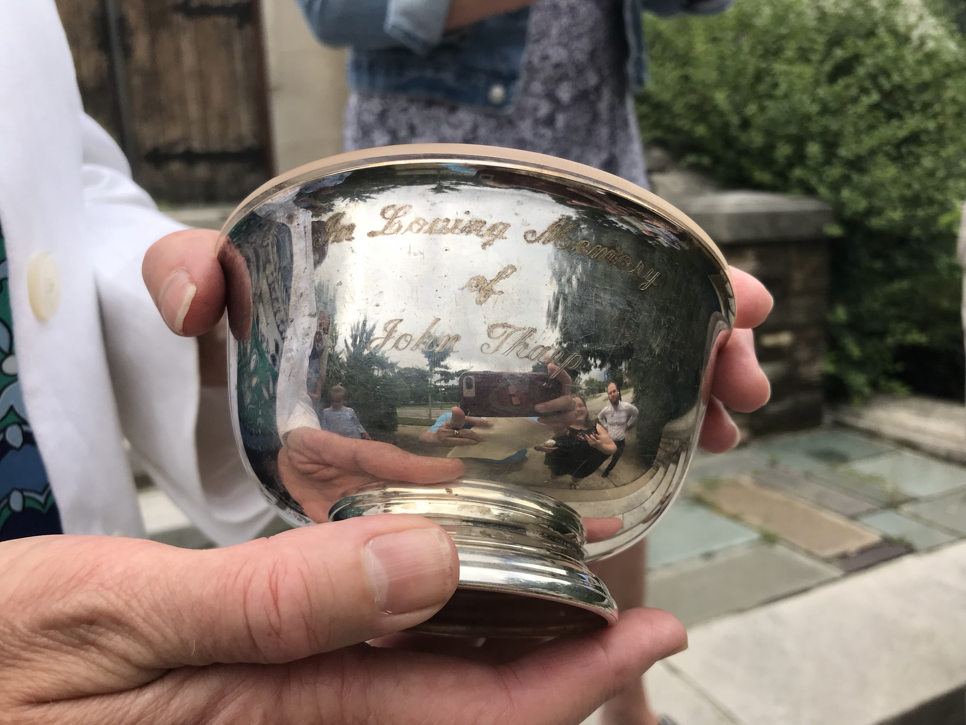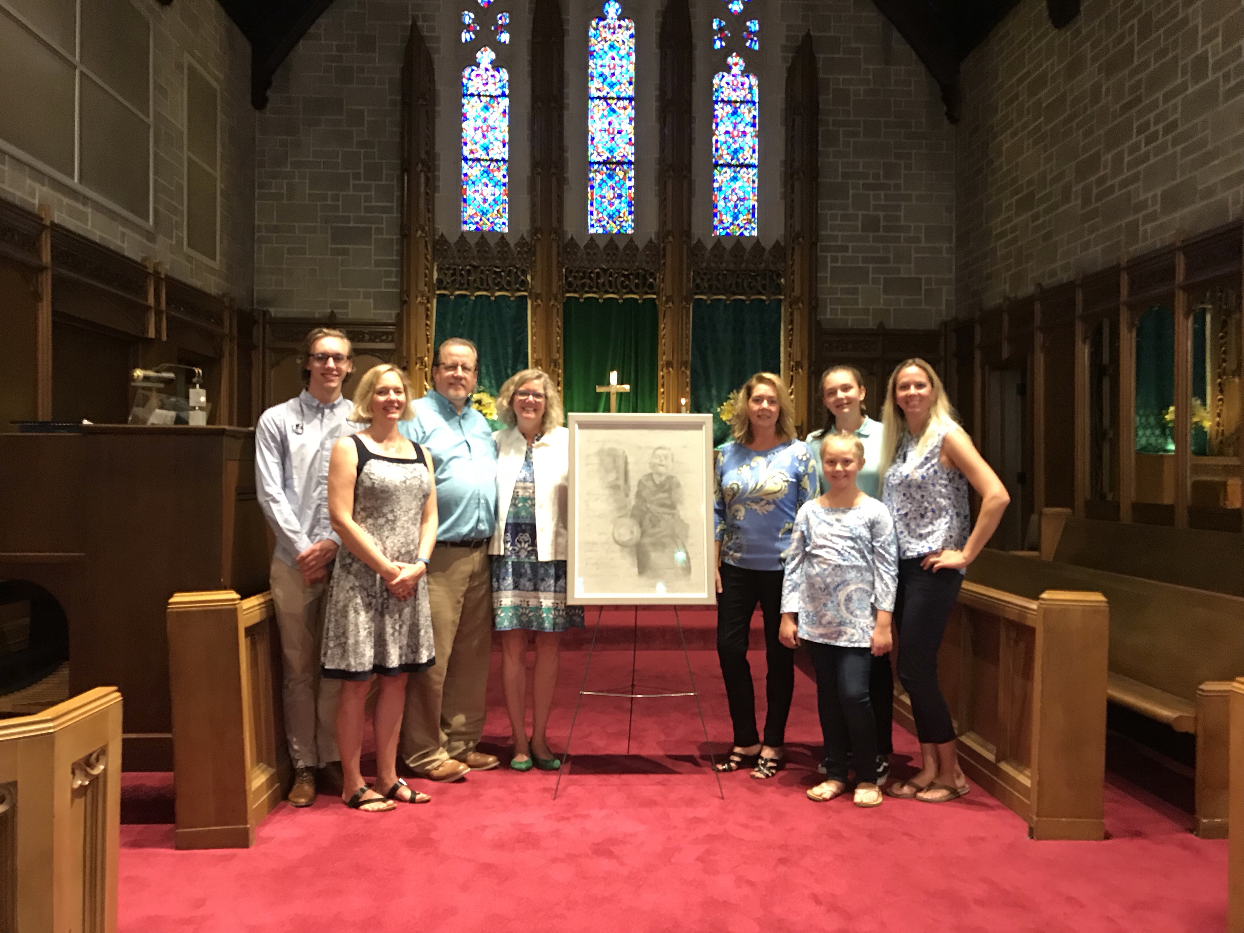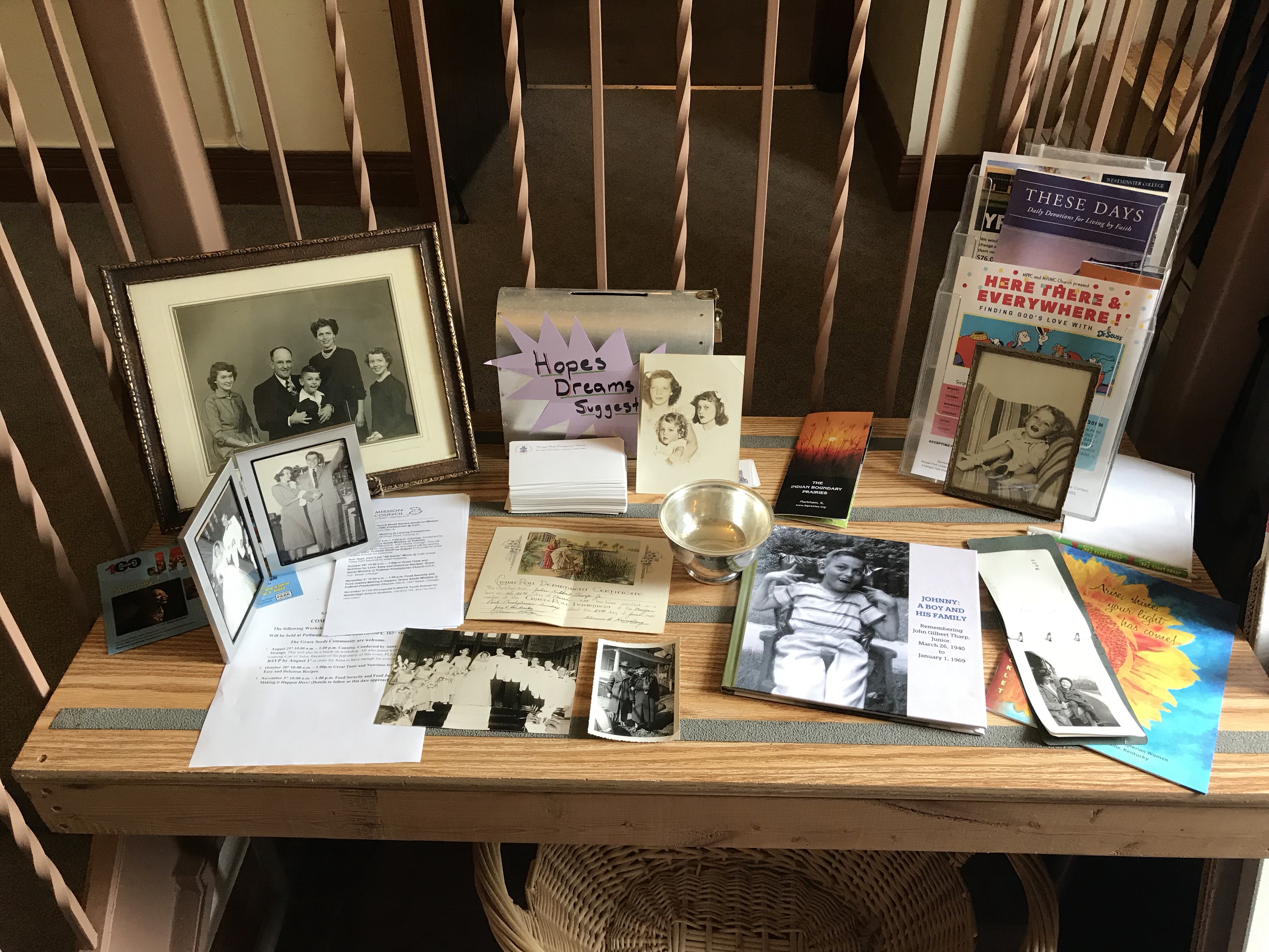 I thanked the membership at Morgan Park Presbyterian Church for their commitment to the spiritual nurture of children. Specifically, I was grateful for one little special needs boy named Johnny Tharp who was on their Cradle Roll 78 years ago. My family and I had a wonderful time talking with people after the service, getting caught up with “family” we had never known. As we packed up the memorabilia we had brought, Pastor Ben emerged from the church basement with a shiny bowl in his hands. He held it out to us joyfully. He had dug around in their dusty repository of old and forgotten items and found an inscribed silver bowl: In loving memory of John Tharp. We were incredulous! And moved. Many links to our past are intangible. But every so often an unexpected gift surfaces that reminds us of the concreteness of human existence. The pastor insisted we take it with us–they had plenty of other lovely memorial items in their dark closet if they needed any! We held it gingerly and looked at the beautiful cursive writing of our uncle’s name. Accepting the gift, we took it to our family cottage on the shores of Lake Michigan where it was part of the reception table set out for 18 young adults and children who are his grand nieces and nephews. Somehow it felt to me like Johnny had finally come home.