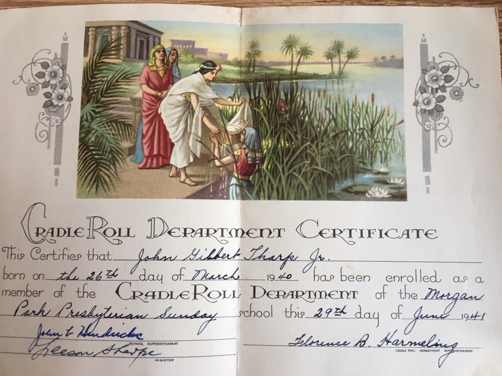 My husband, two sisters, one niece and two great nieces went with me to the worship service. We brought with us various documents and items related to the life of our grandparents’ family in their church. We had the certificate of enrollment for Johnny in the Cradle Roll Program. Johnny was born in 1940 and this was a popular way for congregations to welcome children, aged newborn through four years old, into the life of a supportive church family. Johnny’s certificate assured the Tharps that their brothers and sisters in Christ would tend to his spiritual needs faithfully!