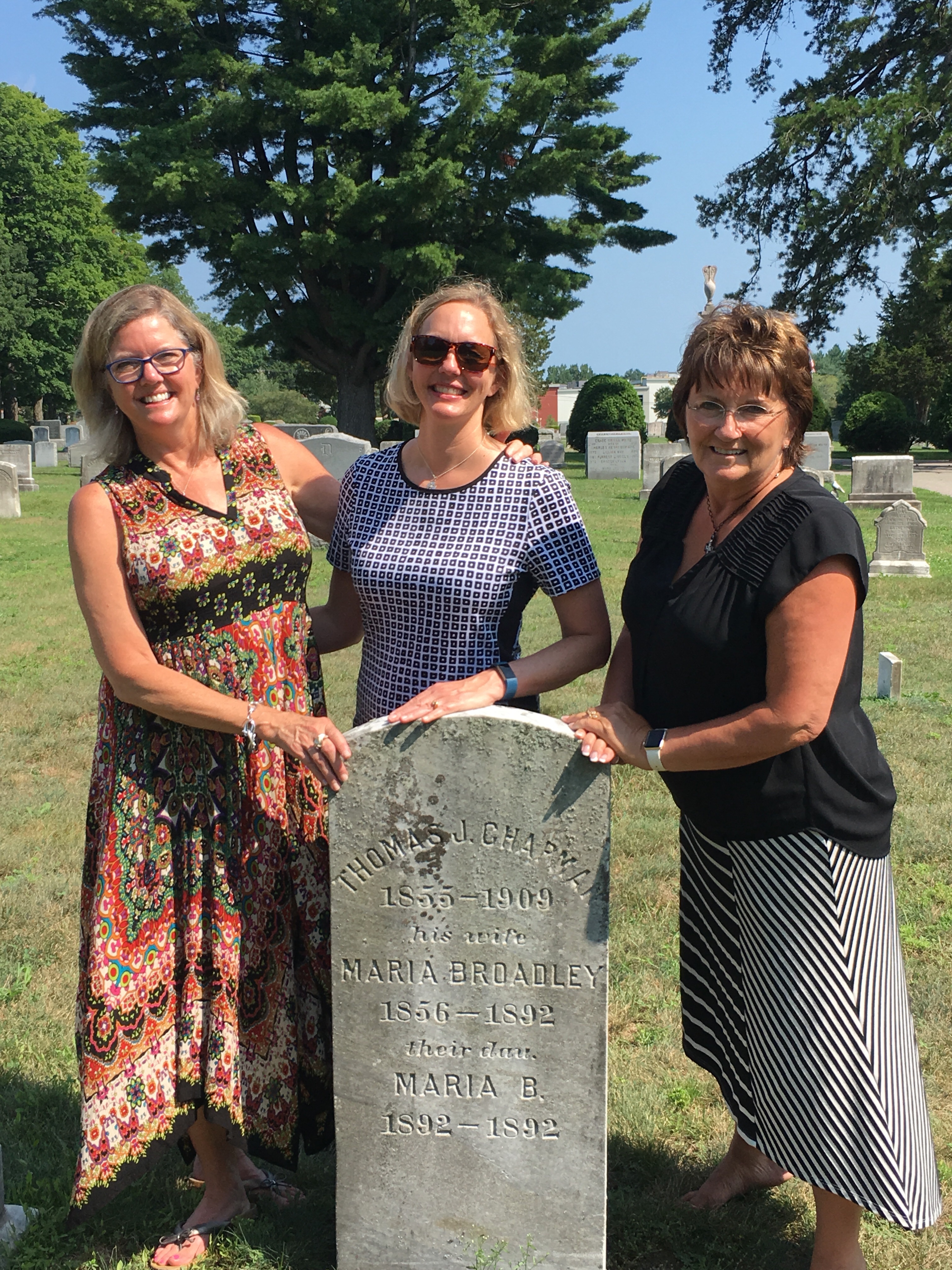 On this trip we got to spend a little extra time in the Exeter Cemetery because the doors to my rented minivan spontaneously locked once we all piled out to look for the Chapman marker. After the thrill (maybe not so much on the part of the teenagers) of finding the stone and taking the obligatory photographs, we discovered we were locked out. Fortunately my cousin Lauren and her husband Randy were with us and they graciously offered to pack the four kids into their rented a car and return them to the hotel room. Since the two nephews were already curled up in the fetal position in the shade, there was no greater gift they could have offered to us. As their overloaded car headed out of the cemetery gates and back toward Haverhill, Michelle and I found two accommodating tombstones and settled in for an indefinite period of time. We were waiting for a locksmith to arrive because of a 1-800 call I had placed to the rental agency. I had wisely opted for the additional expenditure of $3.99 per day that assured quick response in case of roadside emergencies. So no worries!