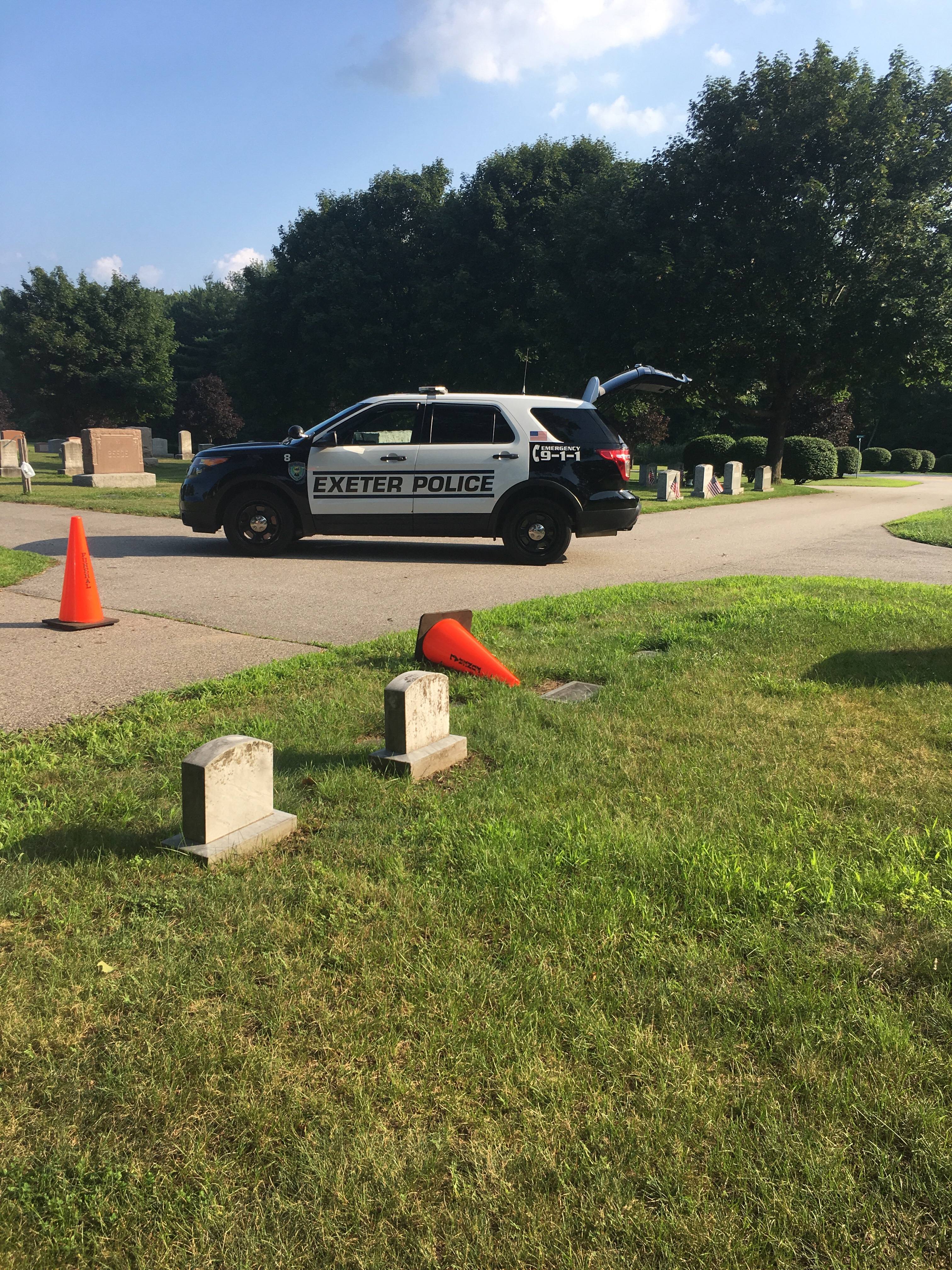 We were heartened by how many people stopped by to offer some form of kindness to us. My van was in the middle of one of the lanes that snake through the cemetery because I expected our time there to be brief. Now it was blocking traffic for the occasional mourner who drove in. A woman rolled down her window and told us we would need to move our car. We explained our predicament. She immediately offered to get us some water and extended her cell phone to us. We thanked her and told her that help was on the way. Another guy pulled up in a truck and was sympathetic, learning of our plight. If people didn’t ask what we were doing we made a point of telling them since we appeared to be taking a leisurely and rather irreverent break in a sacred burial ground. One young man with a backpack strapped onto his body emerged from the nearby woods and hiked his way across the green lawn as if it were a mountain range. There was a groundskeeper who was distinctly disinterested in our situation but mowed rigorously, keeping the Exeter Cemetery in fine condition. One guy pulled up to water the plants at his family tombstone. When he understood our situation he suggested we consider calling the local police department. “They often help people who are locked out of vehicles.” he stated in a wonderful Boston brogue. Since help was on the way we weren’t concerned but decided to write down the number just in case. He told us that he was raised by a single mother. He and his three brothers knew intimately the workings of the local police department from their earlier years! It turned out that his tip would be most useful to us.