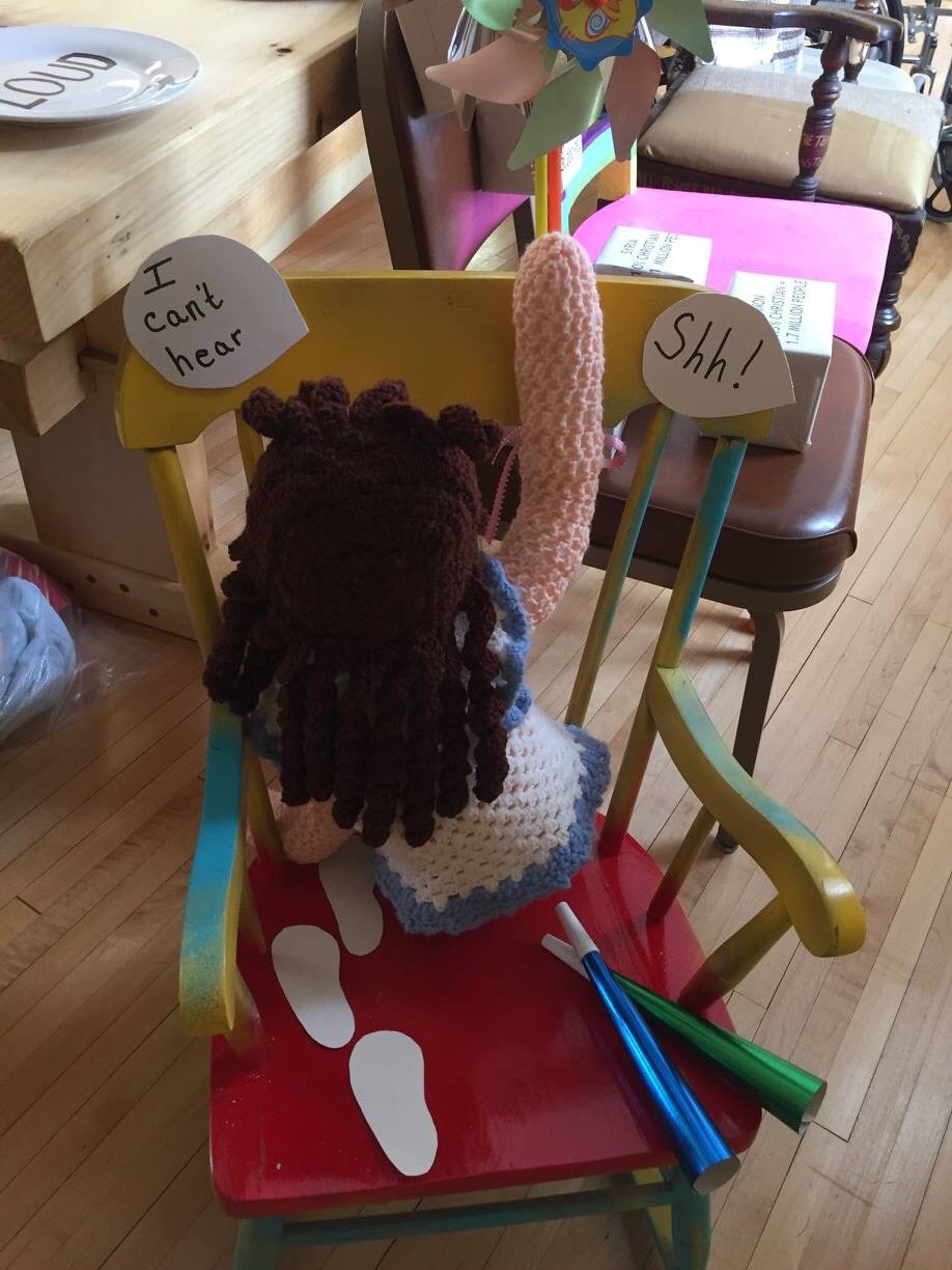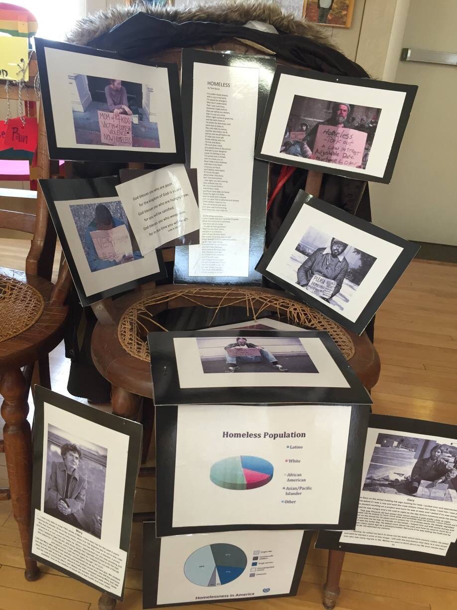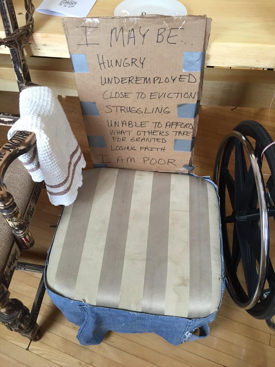 We asked for donations of old chairs. Some were quite nice and sturdy. Others had…real personality. It was a perfect mix! We asked church folks to adopt one of the groups on the list and be ready to transform an outcast chair into a representation of their unique population. Not surprisingly, most people adopted the group that was personal to them in some way. After worship one Sunday our adoptive artists looked over the chairs and chose one that lent itself to the transformation they had already begun to imagine. We had a few gaps in our list so we pulled in unsuspecting people from coffee hour and convinced them to take a chair home. It’s amazing how beautifully our guest list was adopted out to just the right people. Folks had one month to prayerfully design a chair that told a story about their people. Each artist was invited to write an artist’s statement about their work. These were powerful, vulnerable stories that were often auto-biographical in nature.