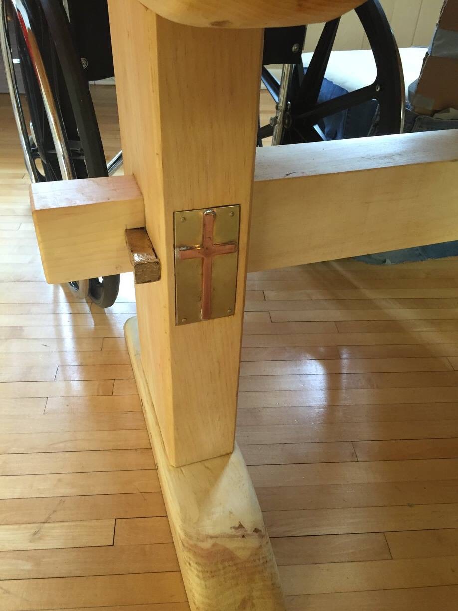 I had also asked my brother-in-law, a woodworker in the church, to construct a table. I told him it had to be long enough for 6-7 chairs on each side. It could be quite narrow. I would have been happy with a plywood creation but he hauled a fallen tree out of the forest in January. He took it to the sawmill to have it planed on a day warm enough for the oil in the giant saw to flow. A tree felled in a storm became a long, beautiful table with metallic crosses inlaid onto each table leg. It was made without nails and didn’t have enough time to dry out before it was hauled into our church.