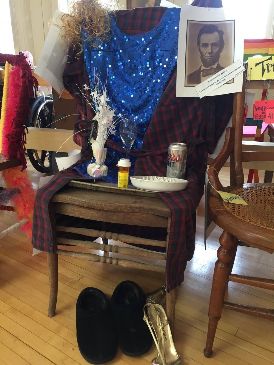 We asked for donations of old chairs. Some were quite nice and sturdy. Others had…real personality. It was a perfect mix! We asked church folks to adopt one of the groups on the list and be ready to transform an outcast chair into a representation of their unique population. Not surprisingly, most people adopted the group that was personal to them in some way. After worship one Sunday our adoptive artists looked over the chairs and chose one that lent itself to the transformation they had already begun to imagine. We had a few gaps in our list so we pulled in unsuspecting people from coffee hour and convinced them to take a chair home. It’s amazing how beautifully our guest list was adopted out to just the right people. Folks had one month to prayerfully design a chair that told a story about their people. Each artist was invited to write an artist’s statement about their work. These were powerful, vulnerable stories that were often auto-biographical in nature.