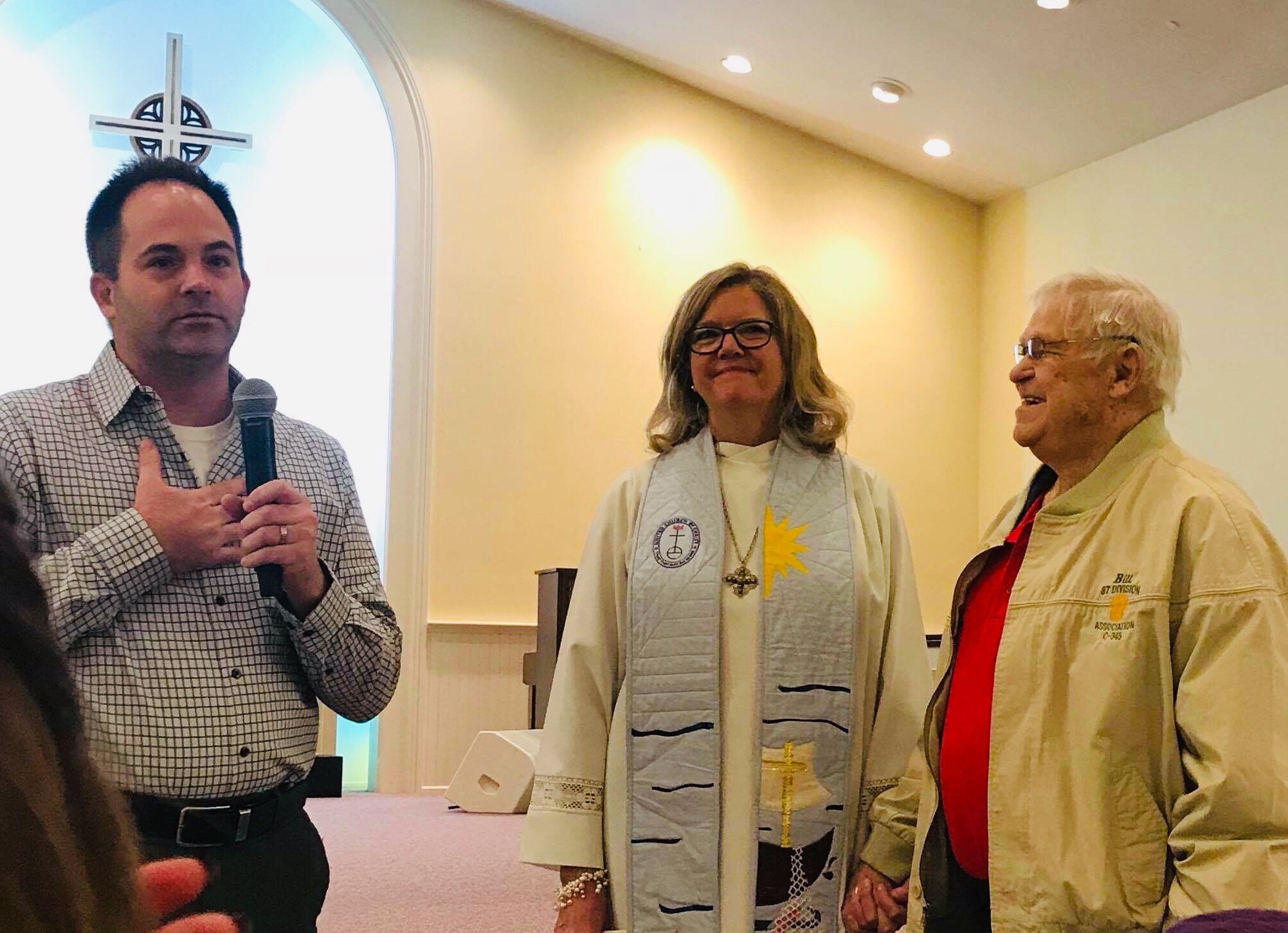 Bill reminded us of why this war was fought with one of his memories. As they advanced into Germany they passed by the Buchenwald Concentration Camp. Bill’s gaze fell at this point in the interview and he grew very reflective. He and his infantry brothers saw the prisoners behind the fence and he found it hard to describe their condition. He didn’t need words because his distraught face said enough. The war against the hatred and atrocities of Hitler became real for us in our sanctuary. I was astounded to learn that the way out of Germany for Bill and other U.S. troops at the end of the war was in the same box cars that were used to transport packed carloads of Jews to the camps. “They smelled terrible,” he told us. “But we got in them and rode all the way across Germany to get home.”