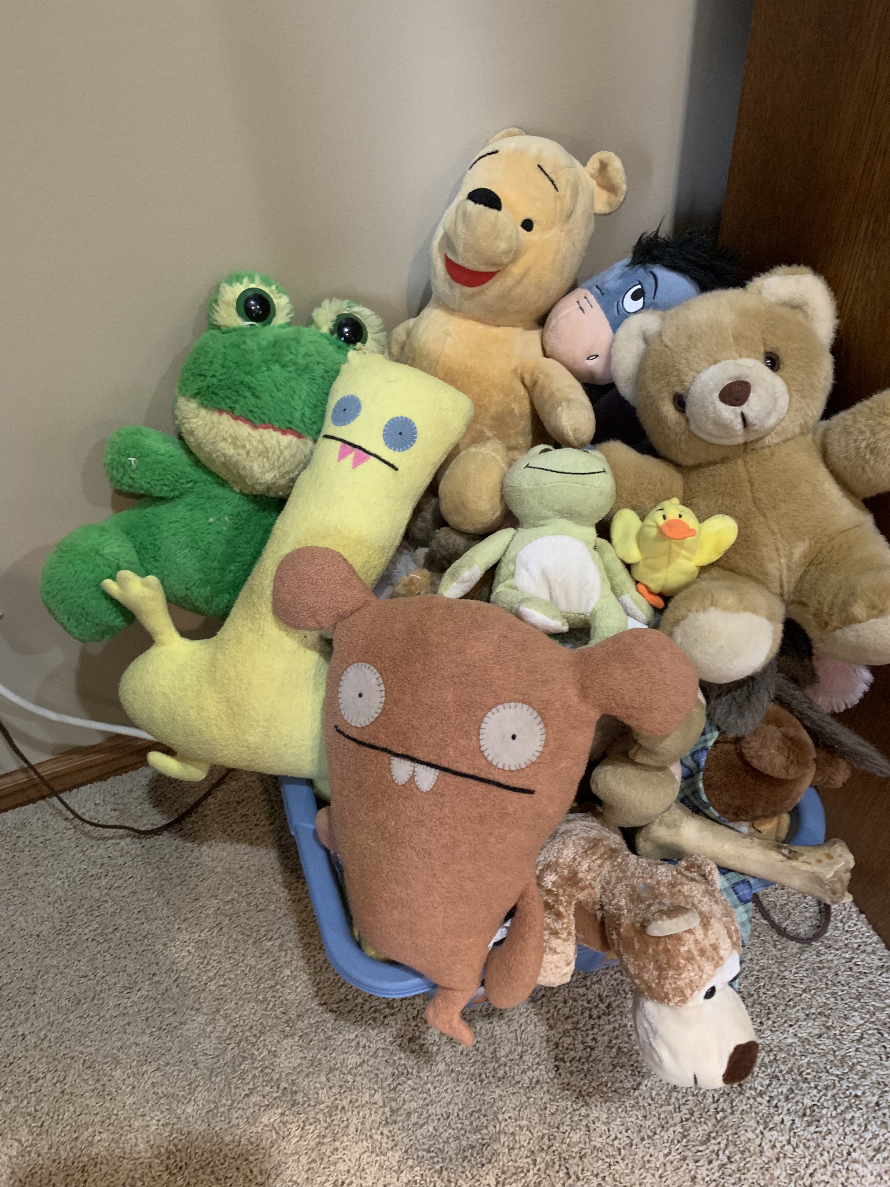 I took my dog with me when I headed to my family’s cottage for a week on the lakefront. He’s gone with me before. Family and friends come in as they are able to enjoy time away from chores and professional obligations. But a good portion of the time it’s just my dog and me. Hunter has always enjoyed the different smells on Lake Michigan. He patrols the beach and sniffs things in the woods as I let him out each morning. The main attraction for me each day is the sunset. I sit on a deck overlooking the lake and he comes with me. Hunter is older this year. Life is harder. He checked things out along the edge of the deck the first few nights. But the fourth night I noticed he wasn’t nearby. I had to stand up to locate him. He was sitting right near the house, quite a distance from the deck, looking right at me. He didn’t come when I called. He was so over the sunset! In fact, he seemed subdued, even depressed. When my kids came down near the end of the week I told them to take him home. It dawned on me that I hadn’t packed any of his friends for our week away. On the main floor we have a laundry basket that is filled with stuffed animals, bones, balls and other odd objects he has claimed as part of his community. When we leave for work each day, he goes to the basket, whining, and finds solace spending the day with them. When we are gone, he is NOT alone! When we are all home for the night and he’s been fed, he finds one of his furry friends, carries her around whining to celebrate what a beautiful moment it is for him. I realized that I had taken him away from his community and he would be better off alone at our house, but in the presence of his laundry basket village. I thought that staying with me in a lovely vacation spot was preferable to being left alone at home while folks were at work. But, when I left him in the cottage to run errands, he was completely alone in a manner I hadn’t considered. His many-colored, soft pals are a big part of his life when his human family is absent! Joe took him back on Thursday night and the reunion video was tender and sweet!