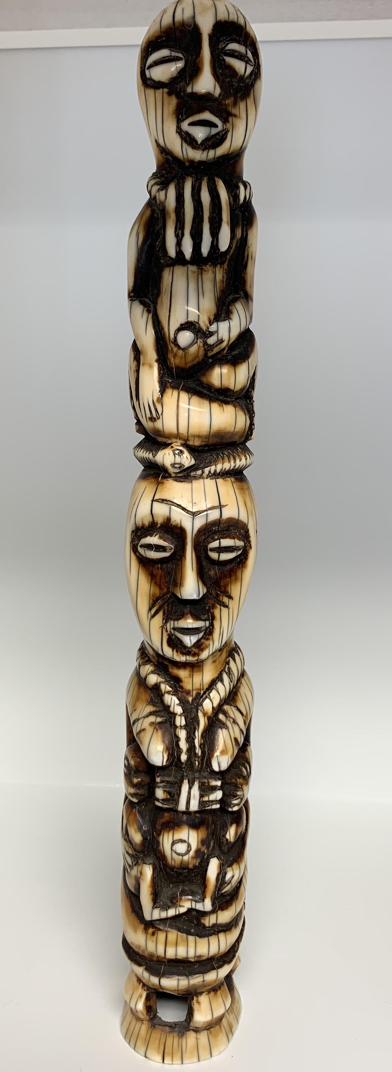 I have a carved sort of totem pole that is made of hippopotamus bone. It came from the time I lived in the Congo while working with the Peace Corps. I was told that it was an artifact that would have been highly valued in a tribe because it was a carving of the Chief’s wife who had had twin babies. You see them on either side of her. She is on the bottom of the carving with the babies and the chief is situated on top of her. He is on top, symbolic of his dominance over her. But she is much bigger than he because her power of procreation was so highly valued, especially with the gift of twins for her husband.