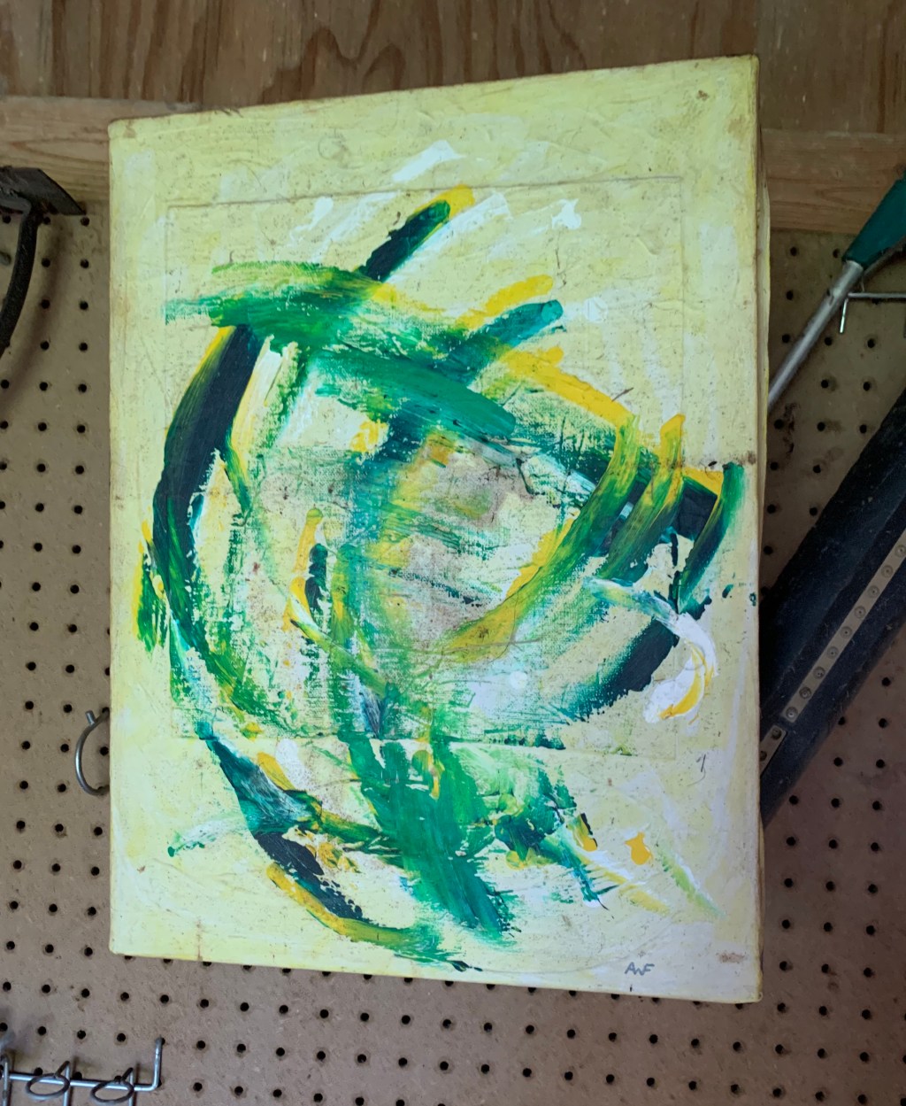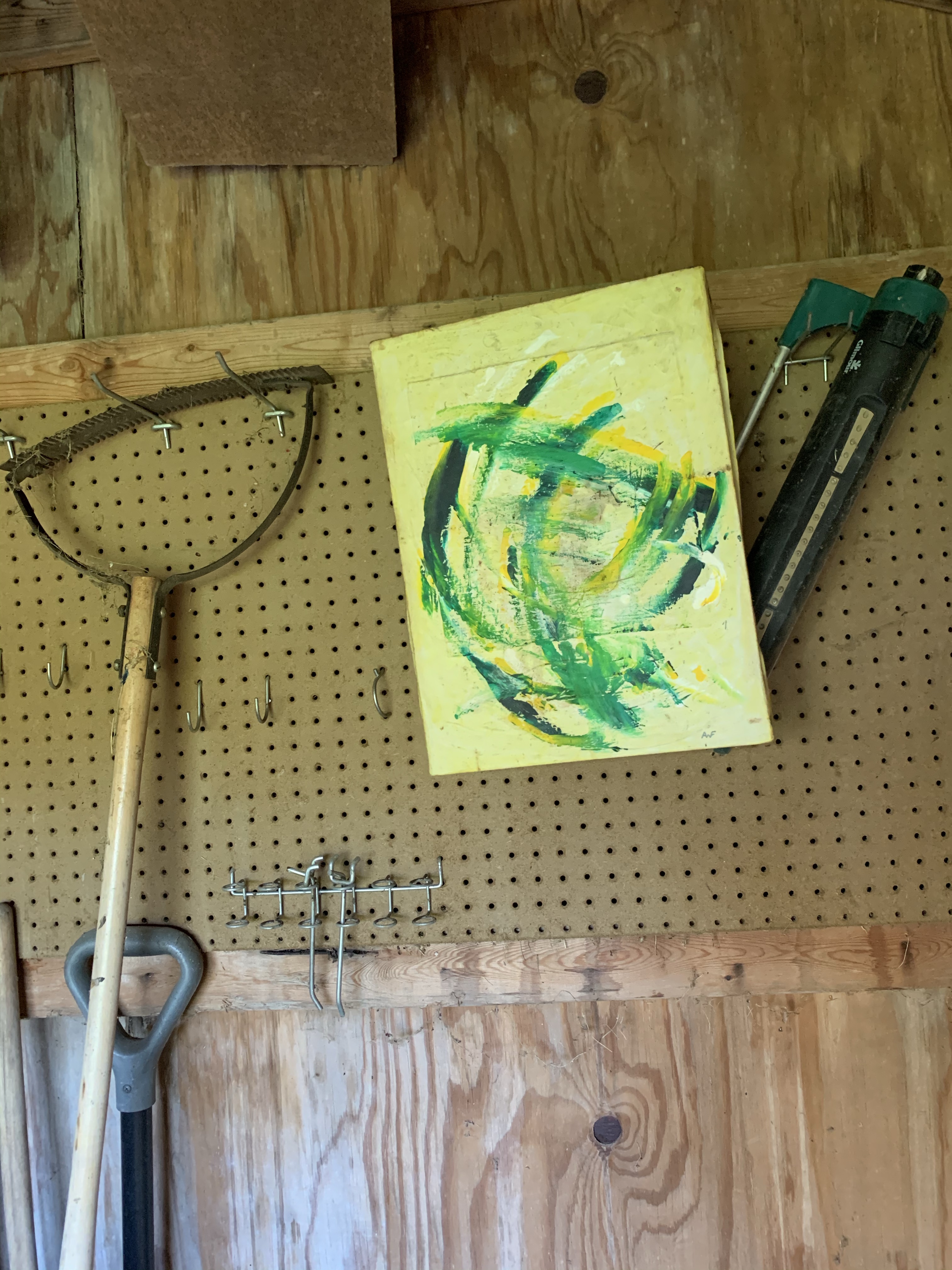 It never did hang in our home. At some point it ended up in our shed and, therefore, survived our house fire that claimed all the art we did have hanging on our walls. It remained hidden from view, in all its glory, in a mouse hotel that lacked for any other décor. To their credit, the mice did not nibble on it at all. Perhaps they saw something in those strong lines that our wedding weekend guests did not. So, after sweeping out the leaves, filling a couple of trash bags, and moving the old wood to a burn pile, I hung the painting in a prominent place—in my well-organized shed.