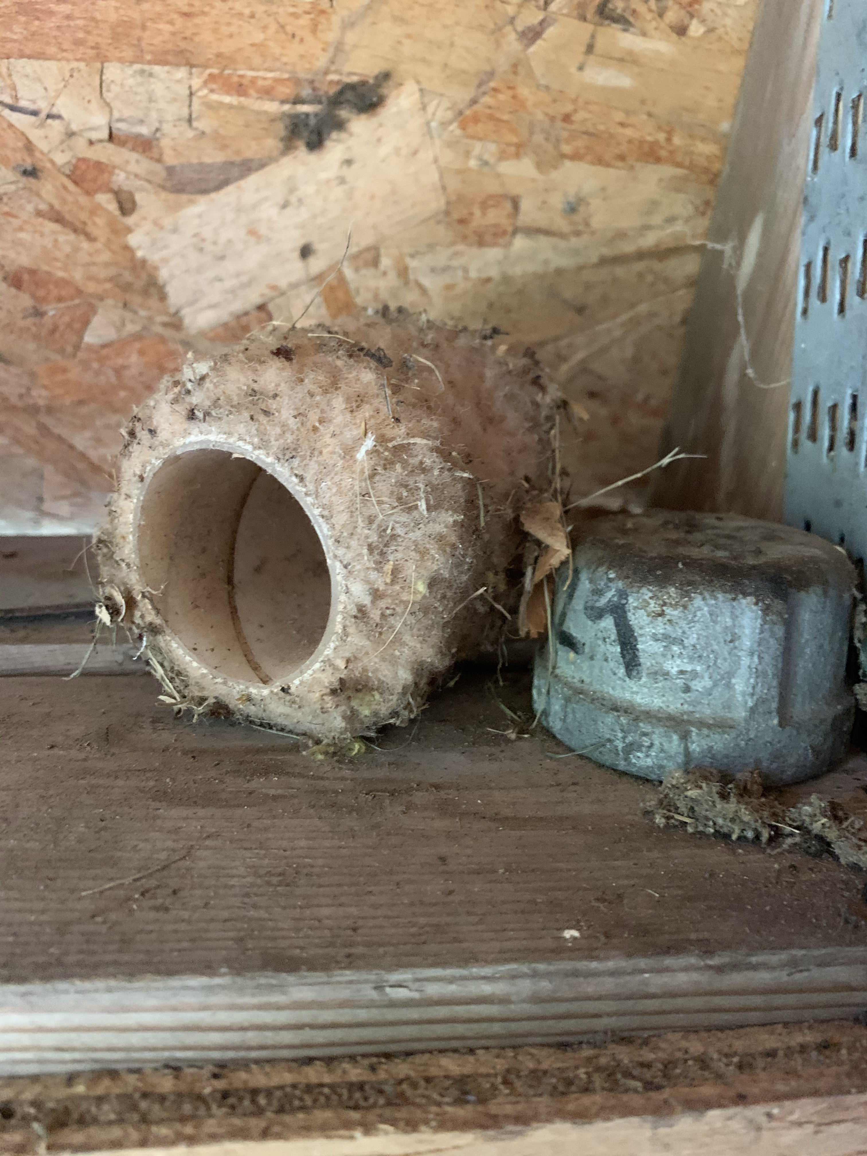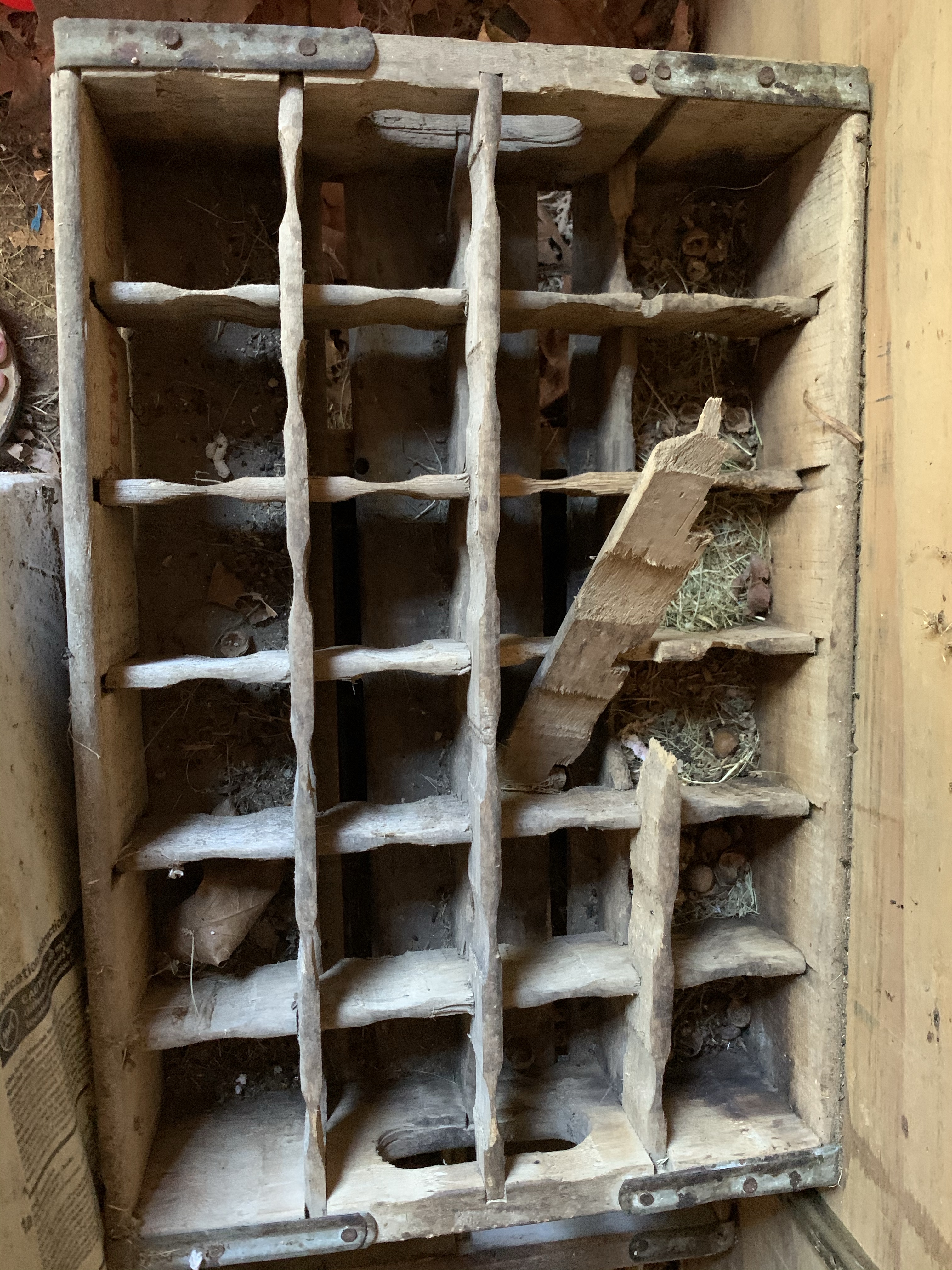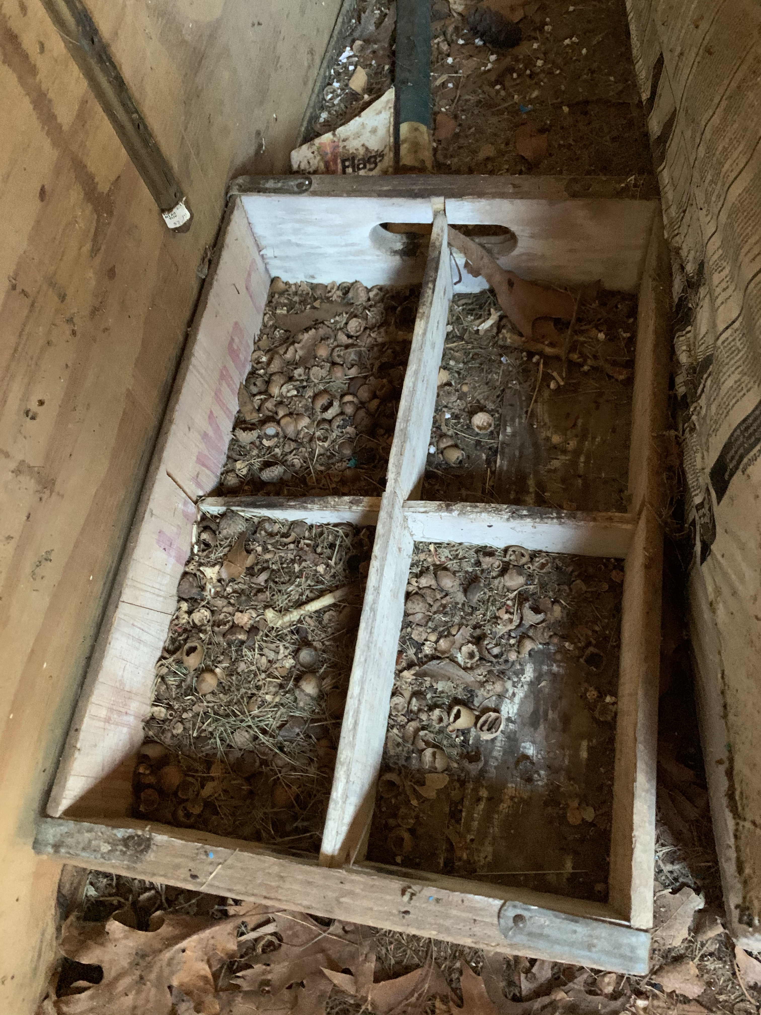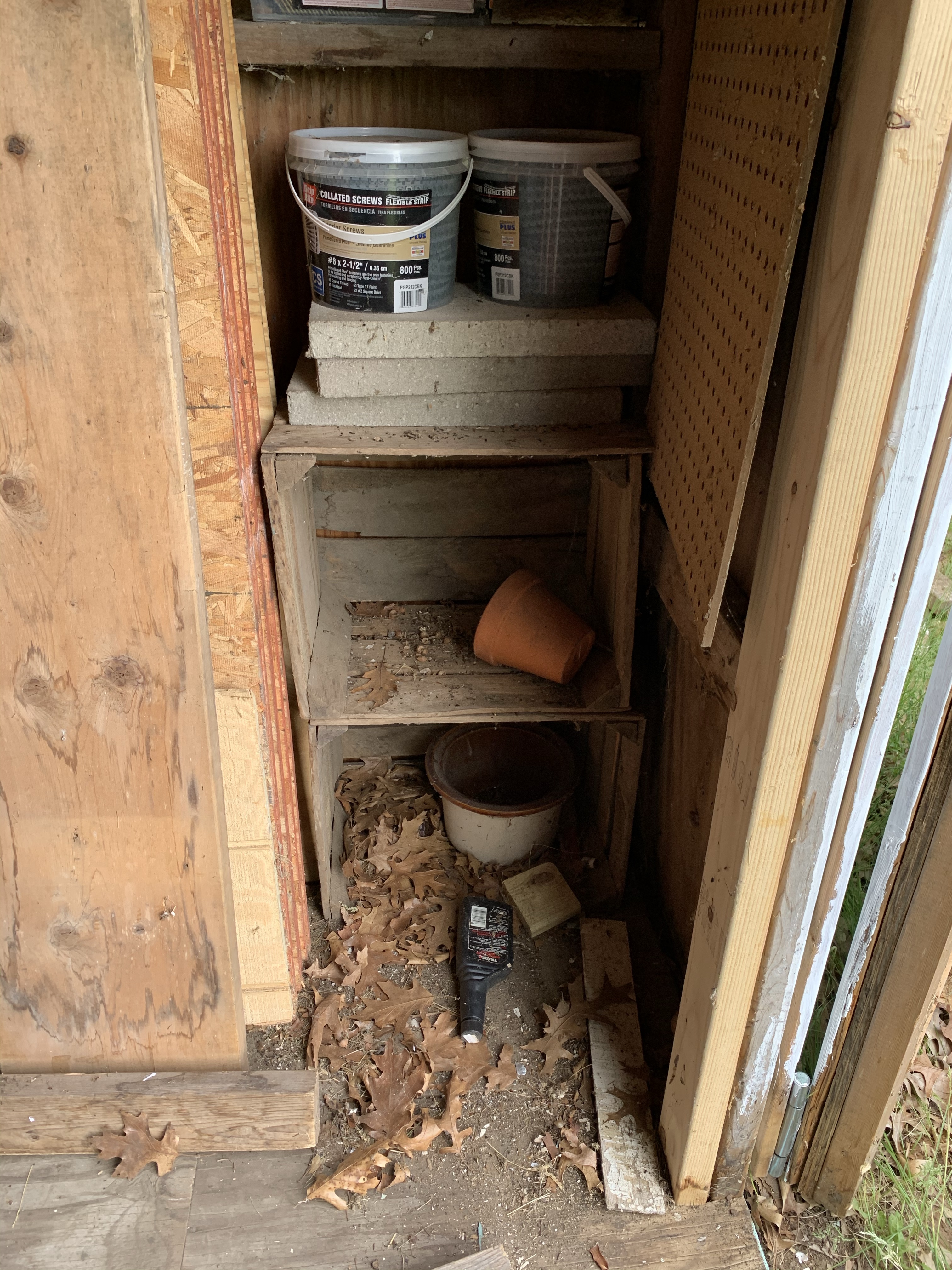 We made this shed out of a pre-fab kit when my now-22-year-old daughter was a newborn. I’ve never cleaned it. Out of sight, out of mind. As I gave a critical look into the nooks and crannies of this 10’ by 12’ structure, I could see that mice have lived handsomely in this space. I had an old wooden crate used to carry Faygo pop bottles. It could have looked quaint on a front porch with flowers in each square. But it sat unused in the shed for more than two decades. It was, in fact, the perfect mouse hotel. Private rooms for all! So that had to be set aside for the burn pile. Acorn shells were jammed into corners and dried oak leaves made for a soft bed. I went to our garage to find a broom and trash bag. Old paint and building supplies were used by the hibernating residents. Crummy shelving units gave even more surfaces for mice to set up shop.