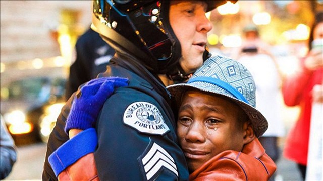 “Free Hugs” offered Devonte on Ferguson streets. So a cop, for a moment, left his beat