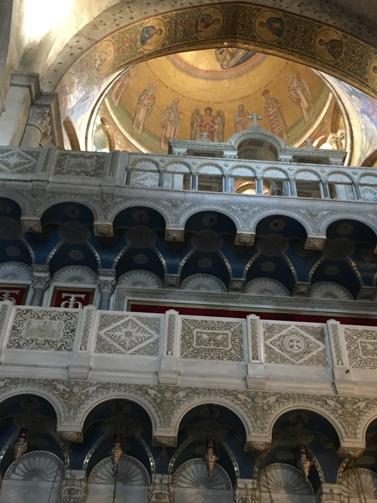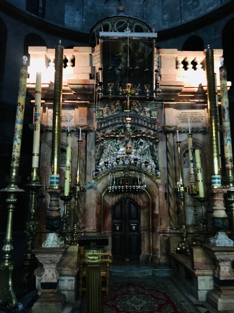 My last morning in Jerusalem was spent in the Church of the Holy Sepulcher. This grand structure is built over the site of Golgotha, the hill on which Jesus was crucified. It is a massive compound that houses some 25 different sanctuaries. Each one is operated by a different Christian denomination. Each jealously guards their own space. Each cleric tries to out-bellow the other in worship. Before I left on my trip, a friend recommended that I soak in the cacophony of worship noises on my visit. I wandered from one unique sanctuary into another. Crusader crosses mark the basement walls from one thousand years ago. Sadly, this sacred space has become a breeding ground for territorial Christians who guard their own sacred turf like my dog protects his bone.