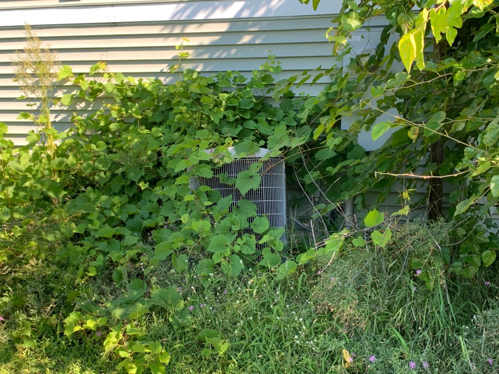 No one looks at that side of the yard. It’s easy for us to ignore it since it faces a big hill and the homes on that side of the house are in the distance. Our neglect of the yard is easy to conceal on that southern exposure. However, I am concerned about our air conditioning unit, which has been a lifesaver many times this summer. I noticed that it was nearly covered with vines, which can’t be healthy for a system whose very function is to inhale air and run it through a cooling system.
