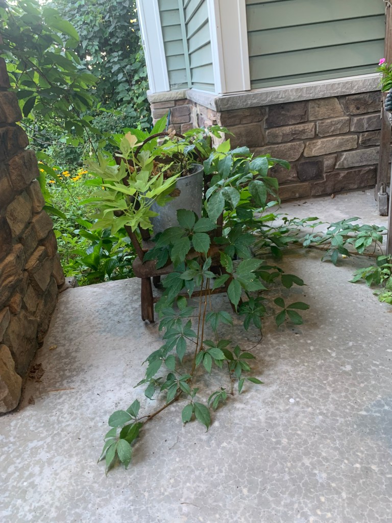 But not today. I covered myself with clothing since a recent spontaneous weeding session resulted in a rash requiring a dose of prednisone. My daughter’s scrubs are my favorite outfit to wear for dirty projects. Instead of a stethoscope, the side pocket holds my phone. I wear a baseball cap that proclaims, “Half Full.” (I’m not so sure about that optimism when confronting these vines!) I have turned old, unmatched socks into arm protection by cutting out finger and thumb holes. They go under my gloves. Boots and socks complete the outfit. With clippers in hand and a tarp for hauling the verdant carnage away, I head to the side yard.