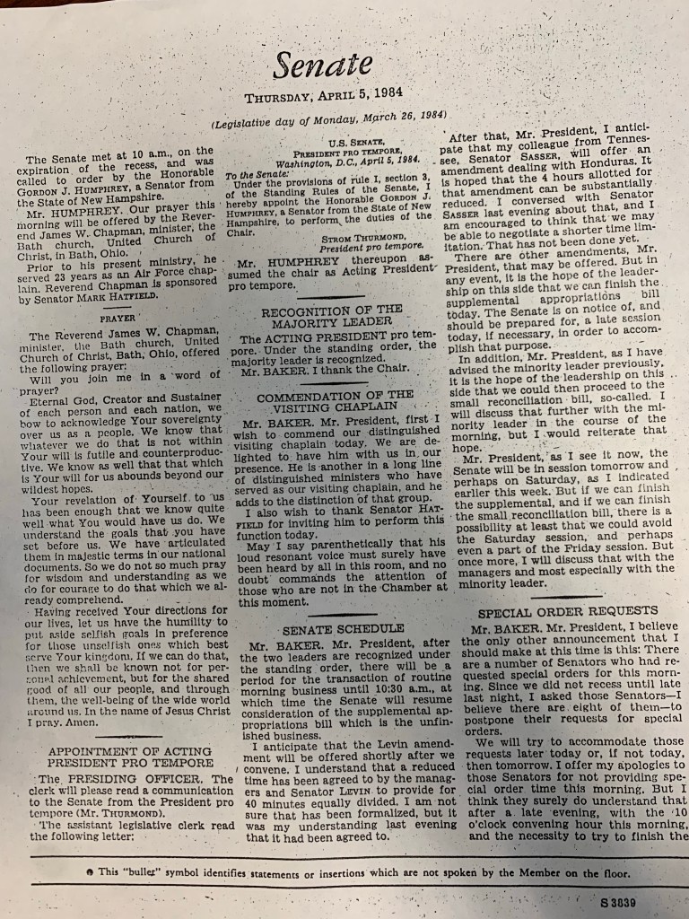 My father served as an Air Force Chaplain for more than 20 years. When he was serving in Bolling Air Force Base, Washington DC, he got to know Senator Mark Hatfield. Hatfield arranged for him to open the Senate on April 5, 1984 with prayer. With a Masters degree in Political Science as well as a Master of Divinity, he regularly combined religion and politics in his personal life. In this case, he was able to combine the two in his professional life. Fortunately the prayer was printed in full in the minutes of the Senate session that day. I stumbled across these documents yesterday and they seemed fitting for election day. I share his prayer with you here: