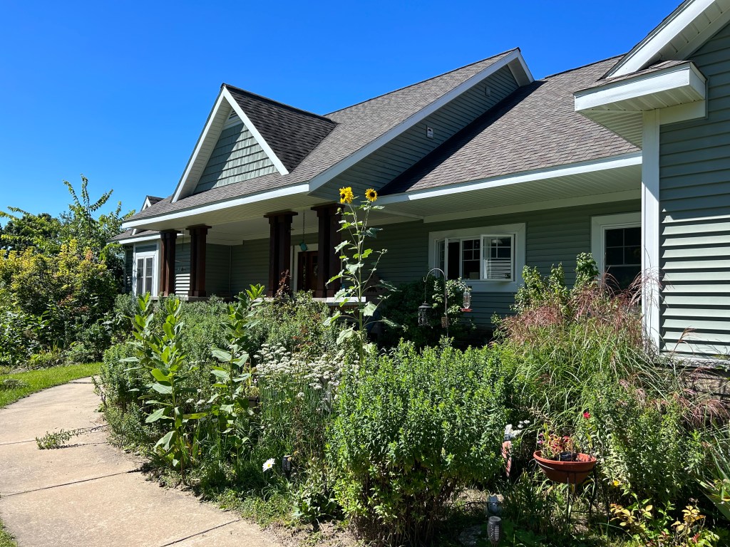 Take a look at my front garden now. It is wildly out of control after a summer of growth. The aster grows to four feet tall, leafy green all summer until late August. Then those non-descript plants burst with purple blooms. I’ve learned to wait. I’ve also got an impressive number of milkweed plants in my front gardens, providing nourishment for monarchs. I don’t favor them as plants but I keep them in place for the butterflies. I have low-to-the-ground mums that stay quiet all summer until winter threatens. Then they show their true colors.