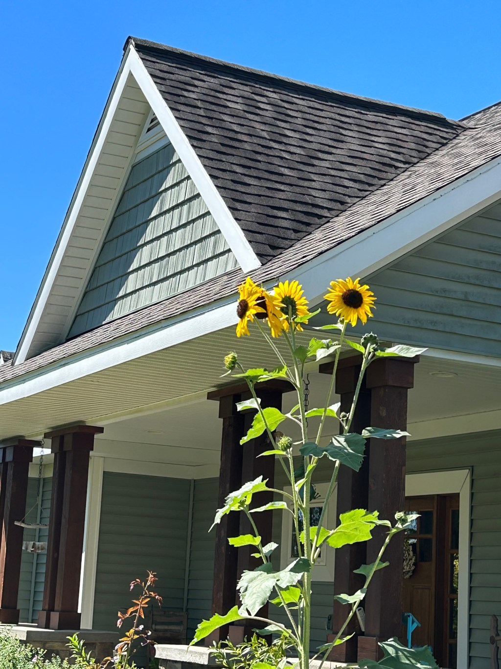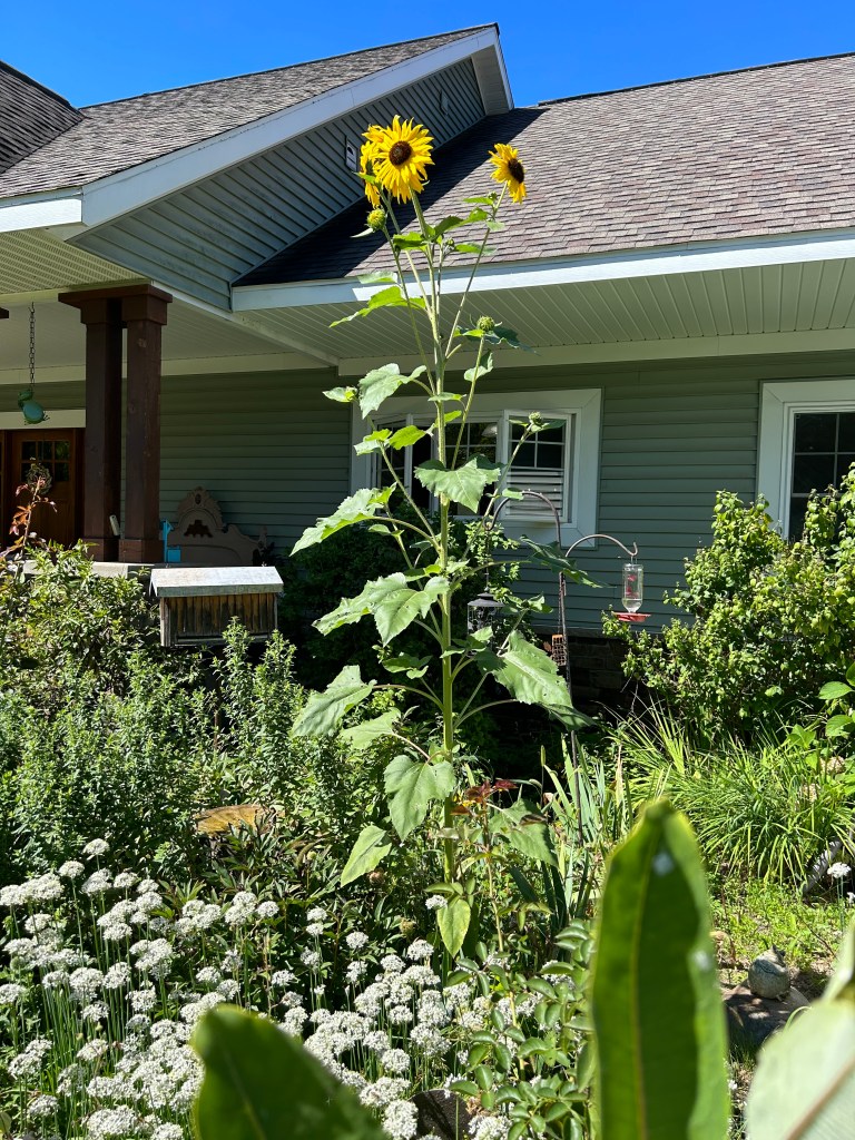 But one plant is a showstopper when I look out my kitchen window at the front lawn: a sunflower plant that is easily eight feet tall. The stalk now supports nine heavy blooms, no small engineering feat. Already the finches are stopping by with some regularity, hungering for the day when the seeds provide a feast for them and their feathered friends.