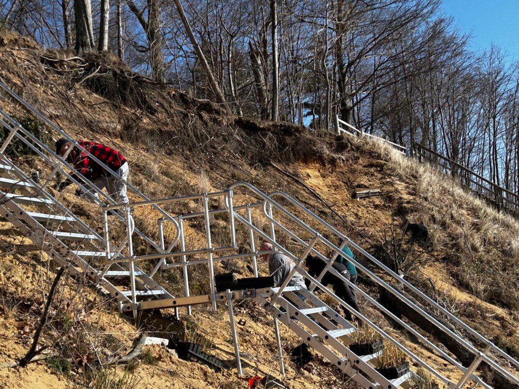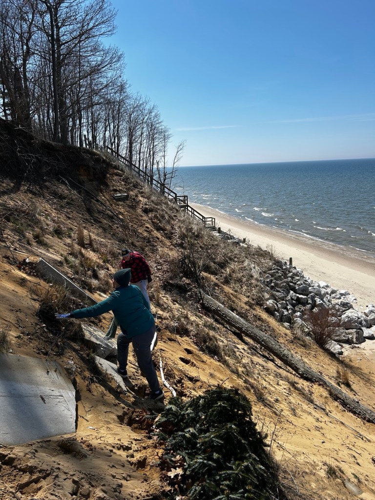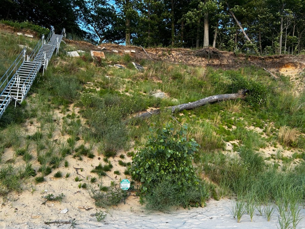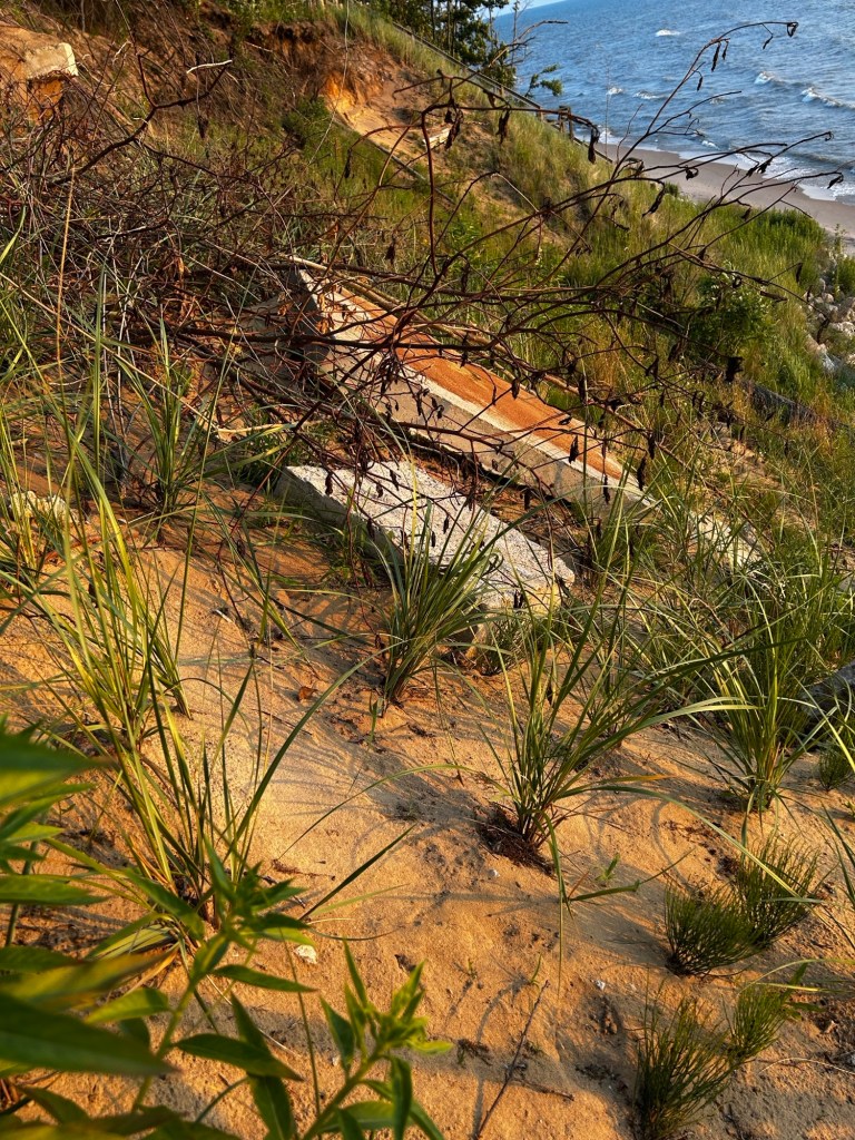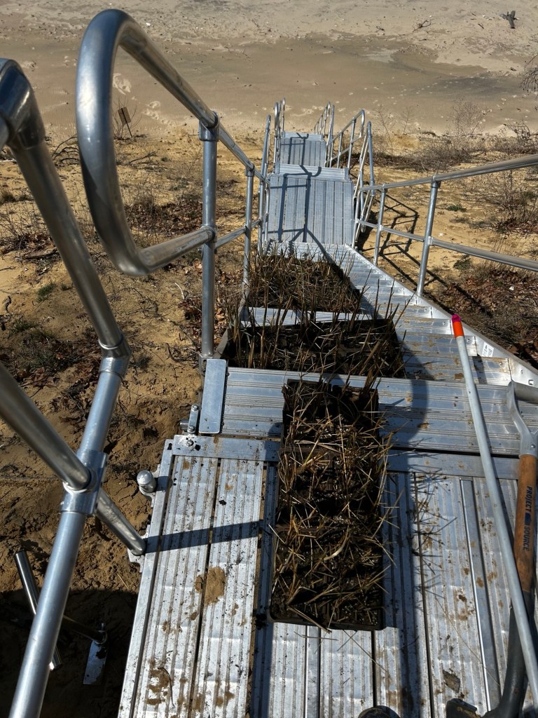 Five of us were able to meet for a long weekend and 4,000 small plugs were delivered. We dedicated a combined 70 hours of labor in 2 ½ days to push fledgling dune grass into cascading sand. At times we were flattened on the incline, Spiderman style, trying to anchor a seedling under the new set of stairs or beneath the fallen trees. It was prayerful exercise: prayers that our work would begin to stabilize this raw drop off and prayers that God would give us the strength needed to complete the job!